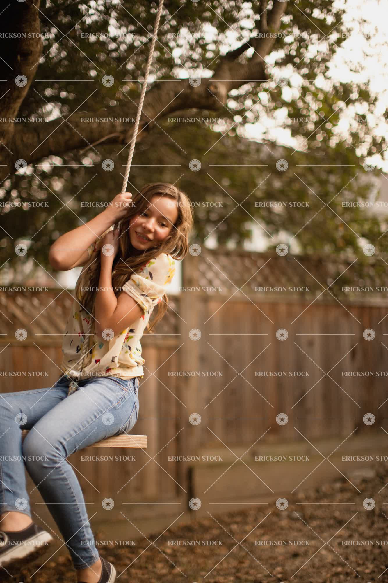 Tags backyard, blue jeans, braces, brunette, button down shirt, carefree, casual clothes, caucasian, cheerful, child, day, denim, dental hygiene, enjoyment, female, friend, friends, friendship, front or back yard, frontyard, frontyards, Fun, garden, gardens, girl, girls, happiness, happy, having fun, jeans, kid, kids, leisure, leisure activities, leisure activity, long hair, outdoor, outdoors, outside, pattern, patterned, patterns, people, person, play, Playful, Playing, plays, recreation, recreational pursuit, recreational pursuits, rope, rope swing, rope swings, ropes, selective focus, shirt, shirts, smile, smiling, Swing, swinging, swings, teenage girl, teenager, three quarter length, Tree, tree swing, tree swings, trees, vertical