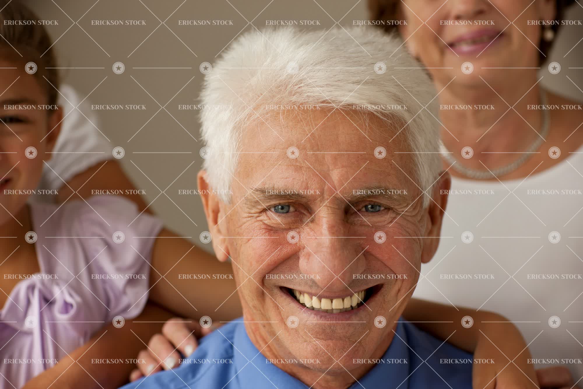 Senior man smiles for a portrait with a woman and a young girl standing behind him with her arm around his shoulders.