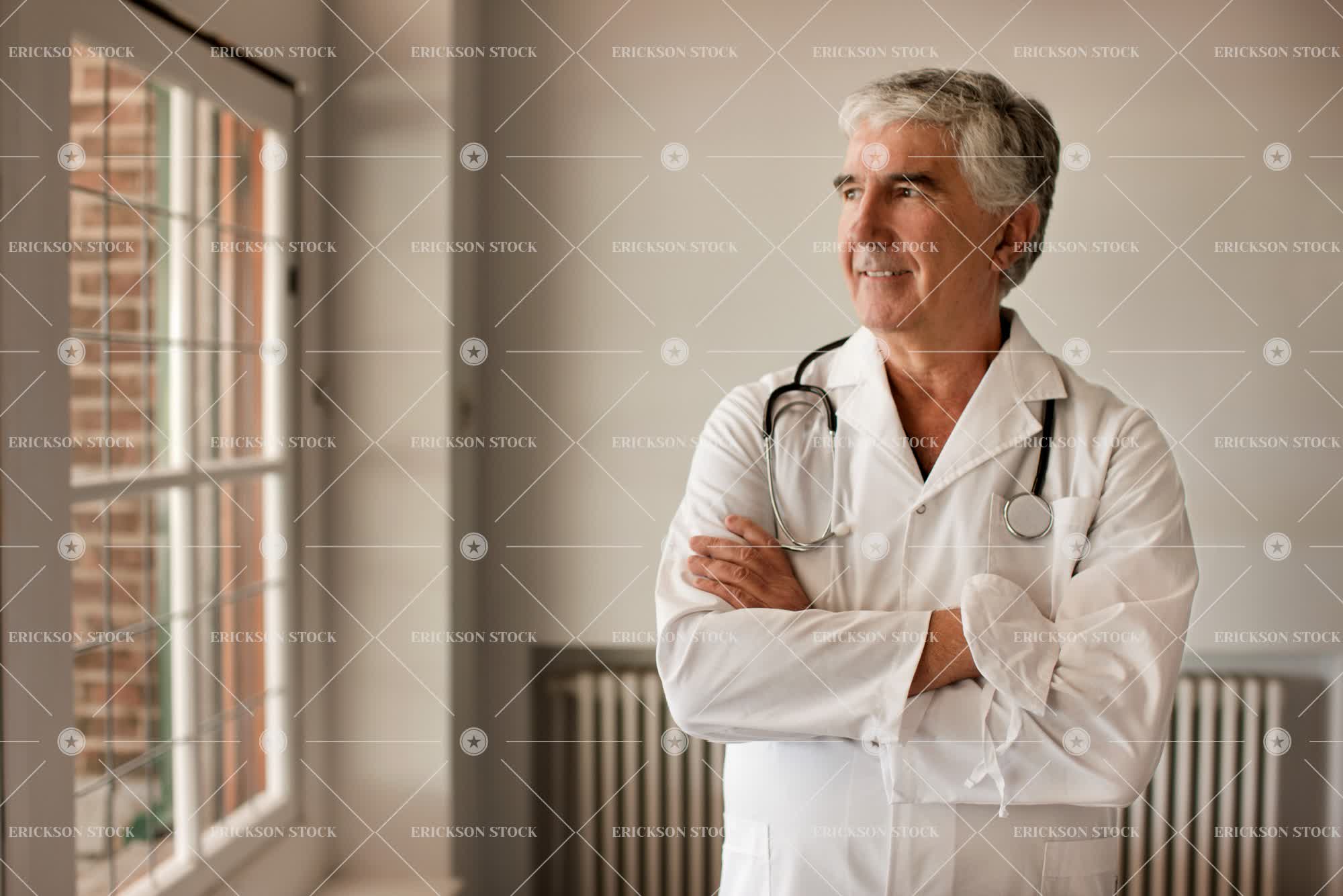 Senior male doctor with a stethoscope sround his neck and his arms crossed looks out a window as he poses for a portrait.
