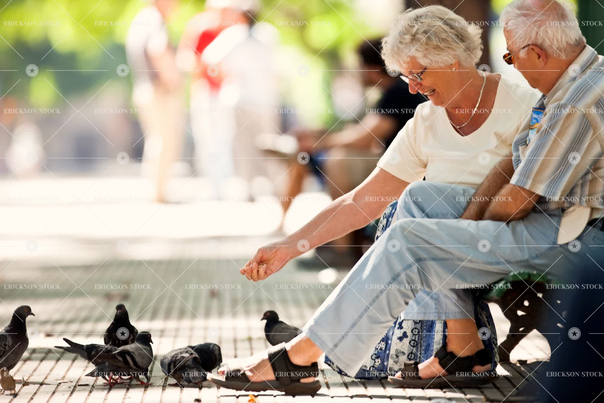 Senior couple sit on a park bench feeding pigeons.