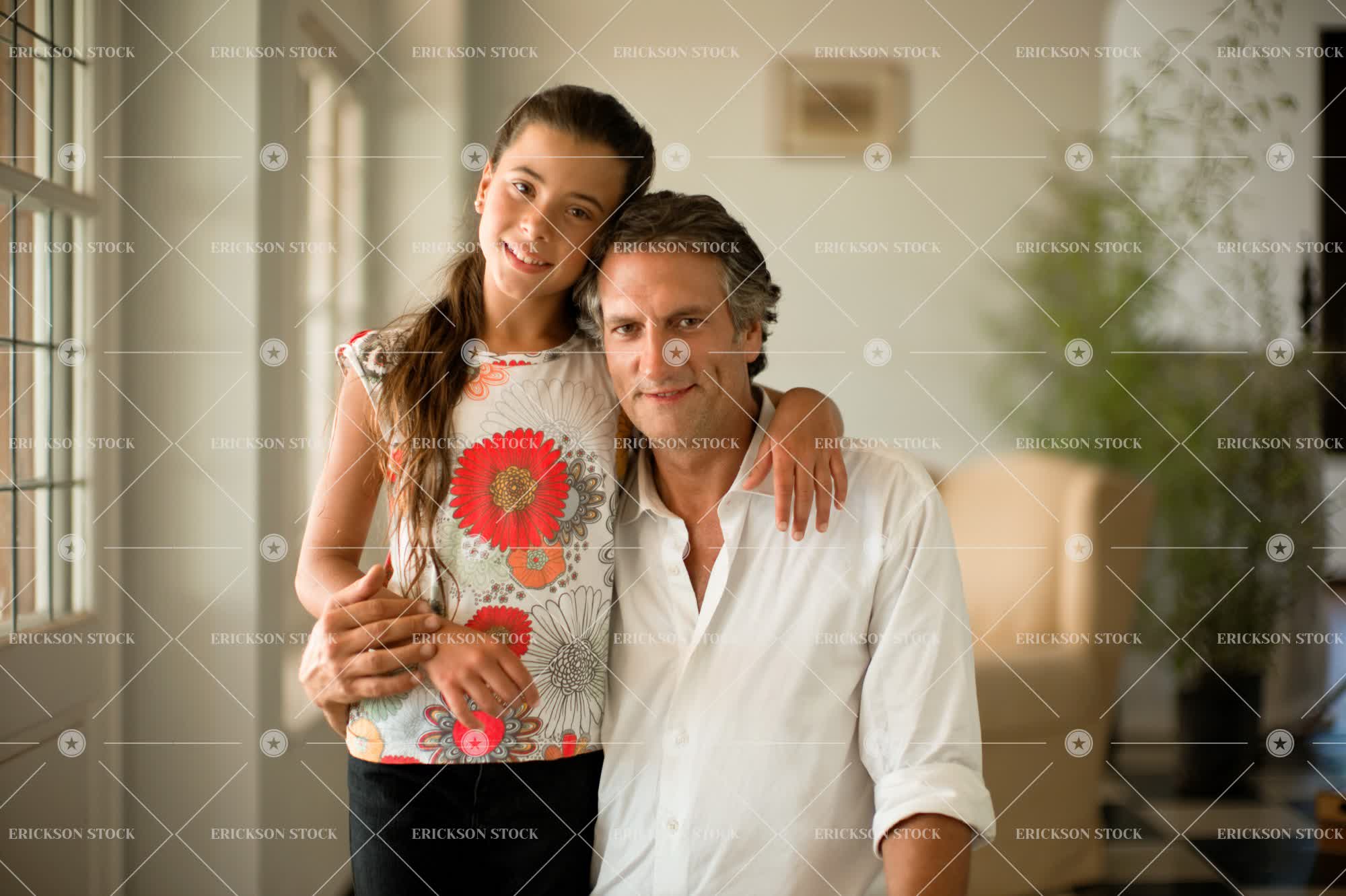 Middle aged father and his pre-teen daughter smile for a portrait with their arms around each other’s shoulders.