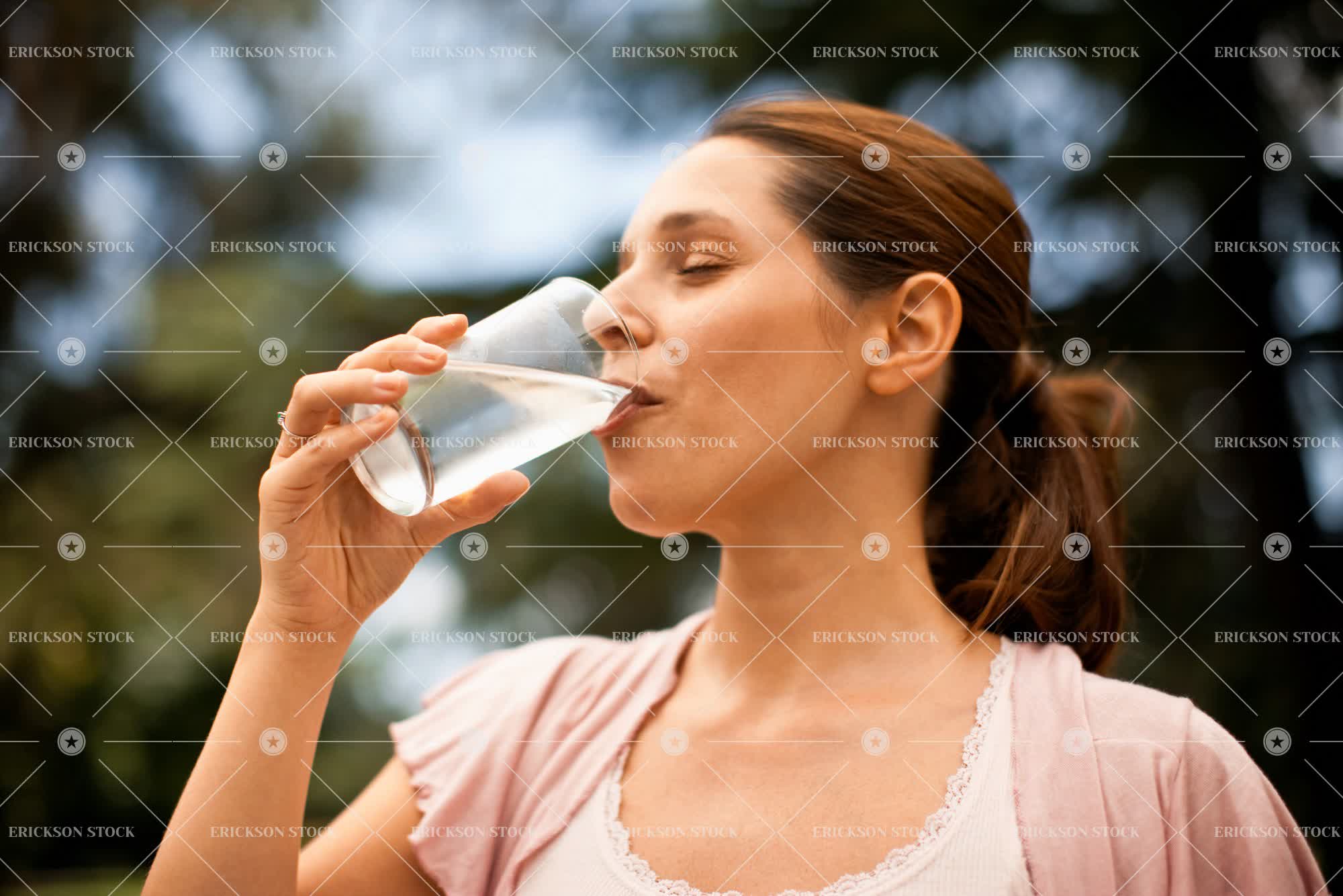 Twenty something woman drinks a glass of water.