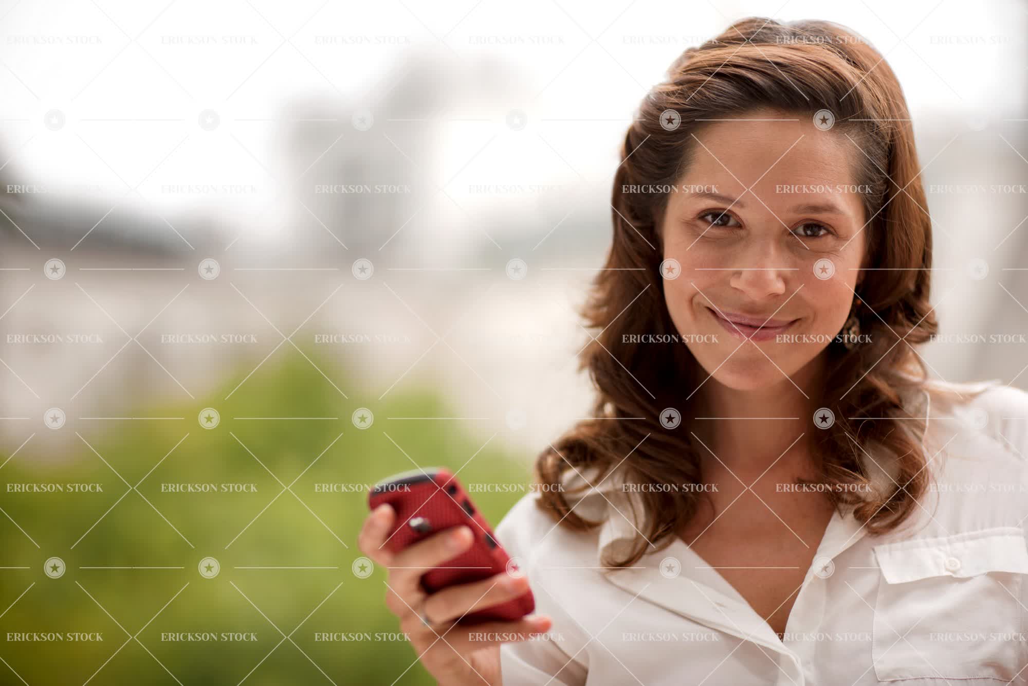 Smiling thirtysomething brunette holds a mobile phone.