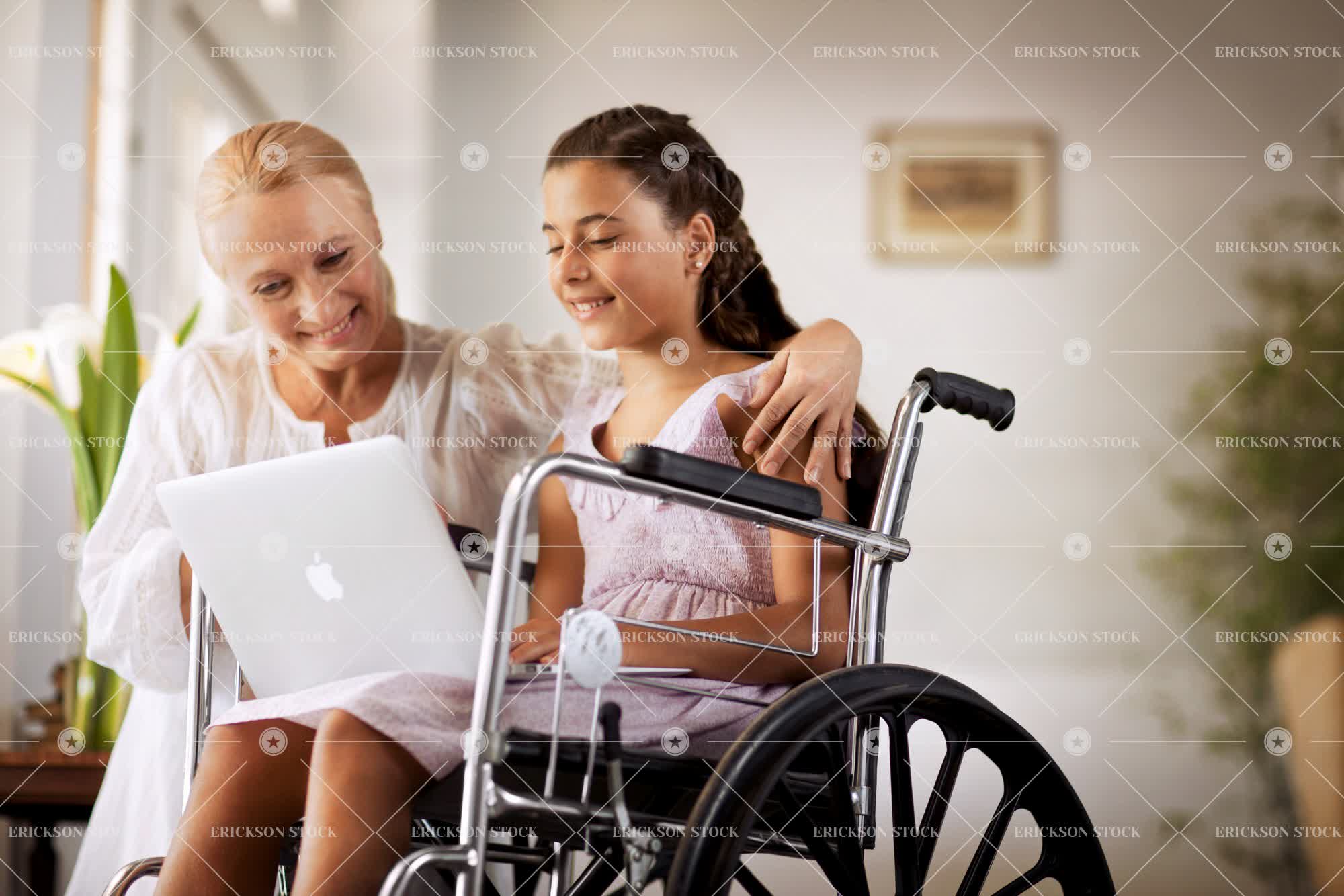 Young girl in a wheelchair, showing something to her grandmother on a laptop.