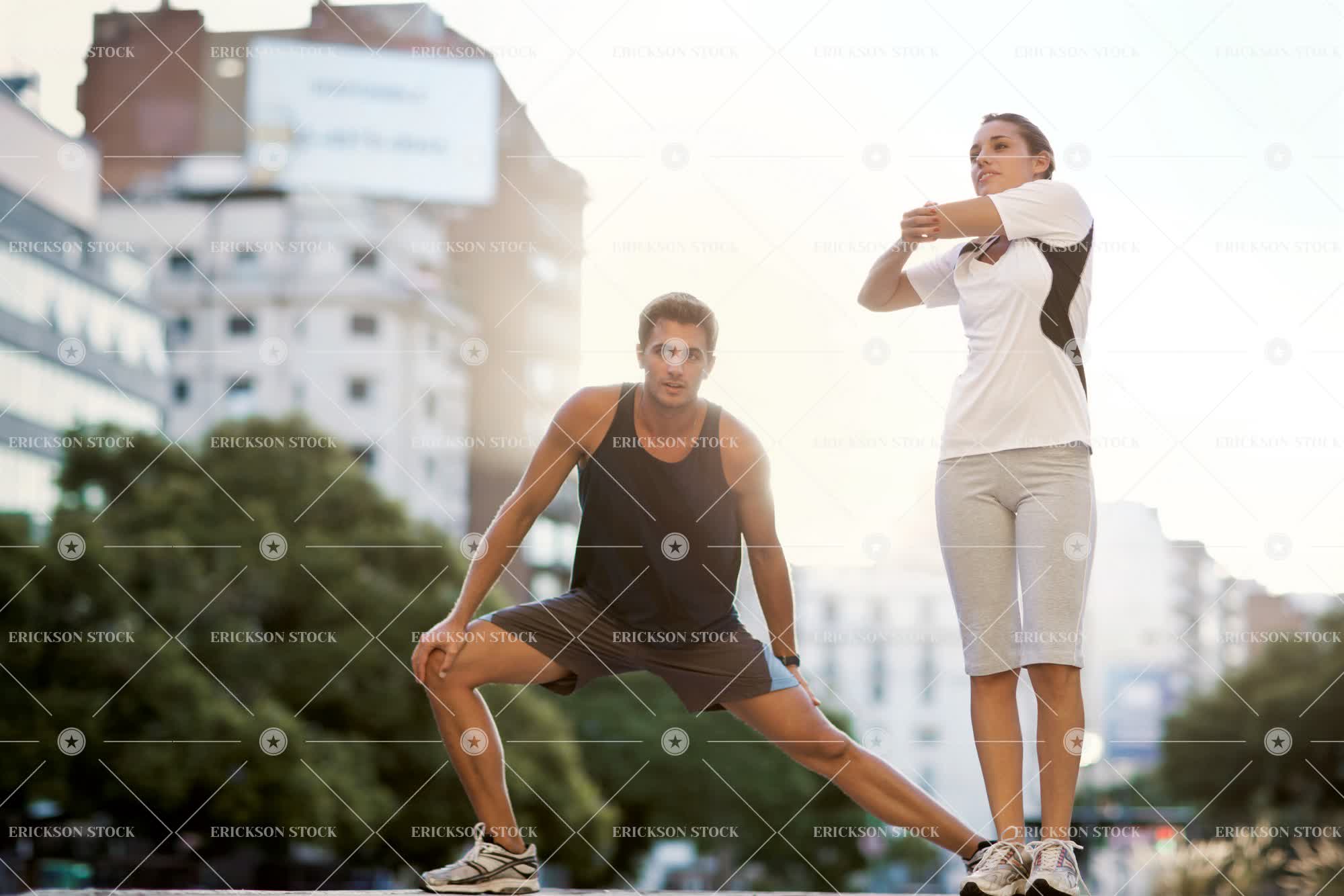 Young couple stretching before a workout.