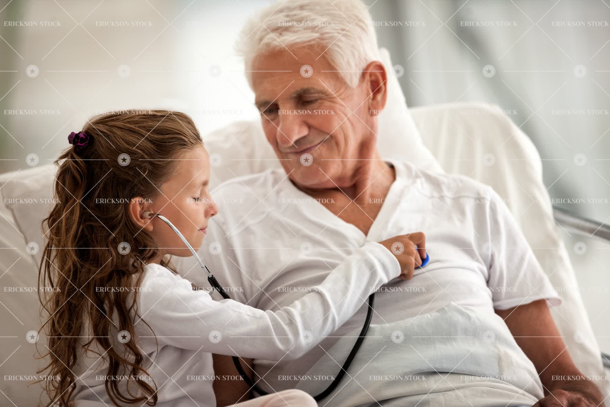 Elderly man receiving a hospital visit from his granddaughter, who is playing with a stethoscope.