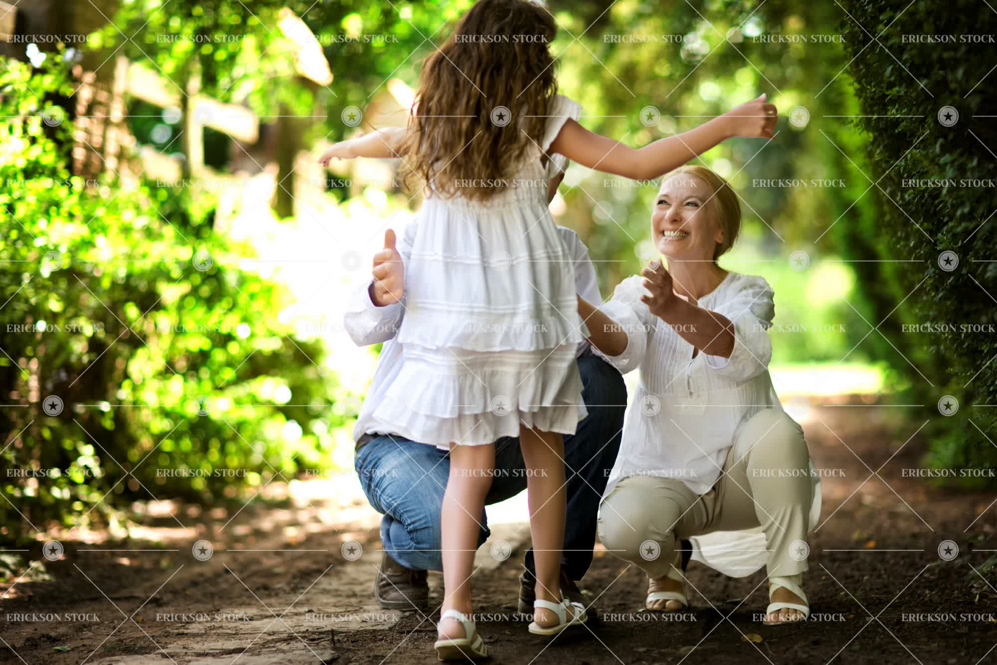 Young girl runs towards her grandparents on a quiet country road.