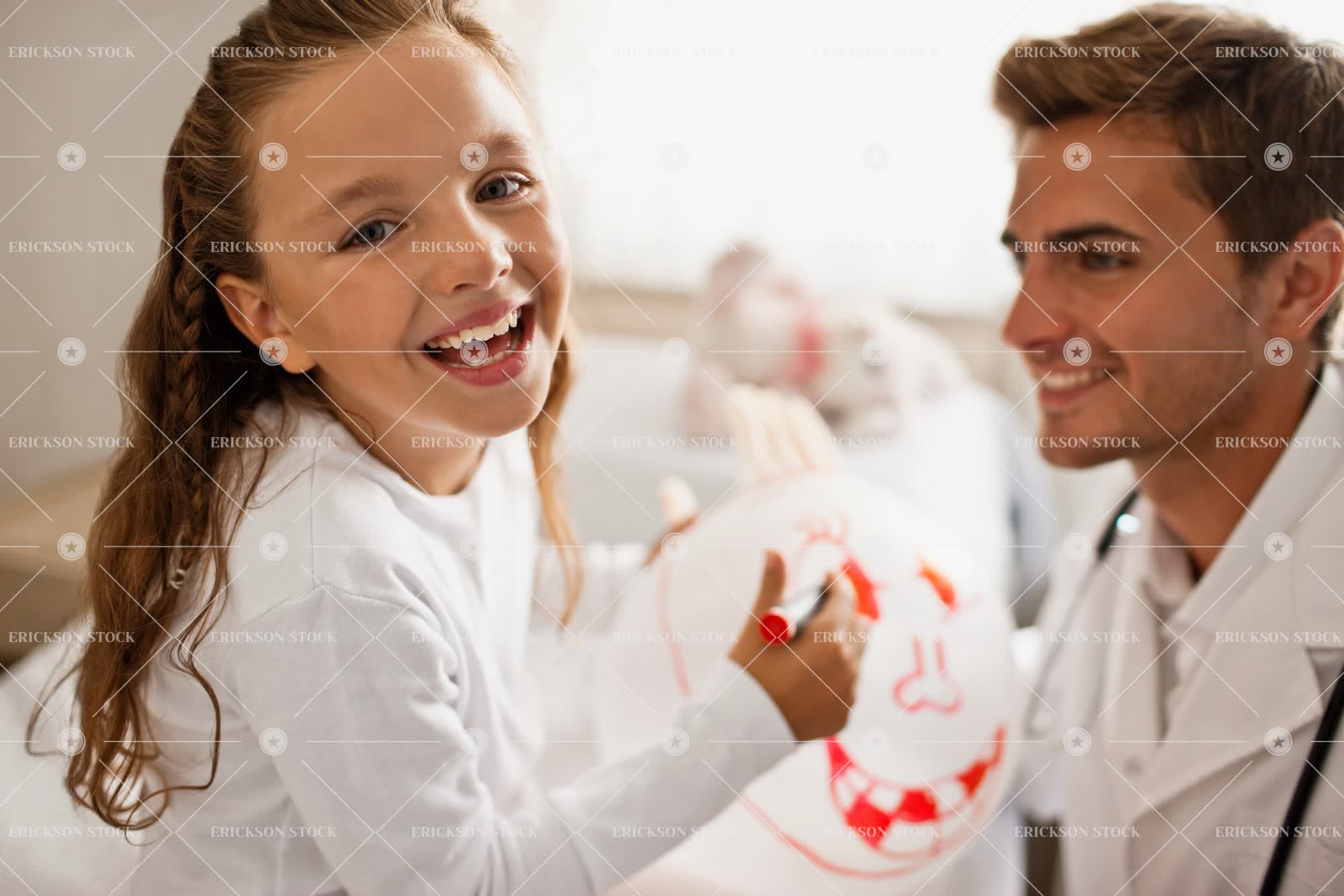 Tags adult, assist, balloon, balloon with face, bed, blow, blown up rubber glove, care, caucasian, cheerful, child, clinic, coloring, comfort, console, create, delight, doctor, drawing, elementary age, enjoyment, expert, expertise, experts, Eye contact, felt, felt pen, female, Fun, girl, girls, happiness, happy, having fun, head, head & shoulders, head and shoulders, head shot, headshot, health, healthcare, healthcare and medicine, horizontal, hospital, hospital bed, hospital beds, hospital room, hospital rooms, hospitals, ill, illness, indoor, indoors, inside, joy, joyful, kid, kids, leisure, leisure activities, leisure activity, look at camera, looking at camera, male, man, marker, marker pen, md, medical, medical practitioner, medical practitioners, medicine, mid adult, patient, patients, pen, people, person, physician, physicians, play, Playful, Playing, plays, portrait, Portraits, pre-adolescent, pre-adolescents, Pre-teen, pre-teens, preteen, preteens, problems, recreation, recreational pursuit, recreational pursuits, rubber glove, rubber glove balloon, selective focus, shoulders, sick, sickness, smile, smiling, specialist, specialists, sphere, stethoscope, stethoscopes, together, togetherness, tween, two people, young adult