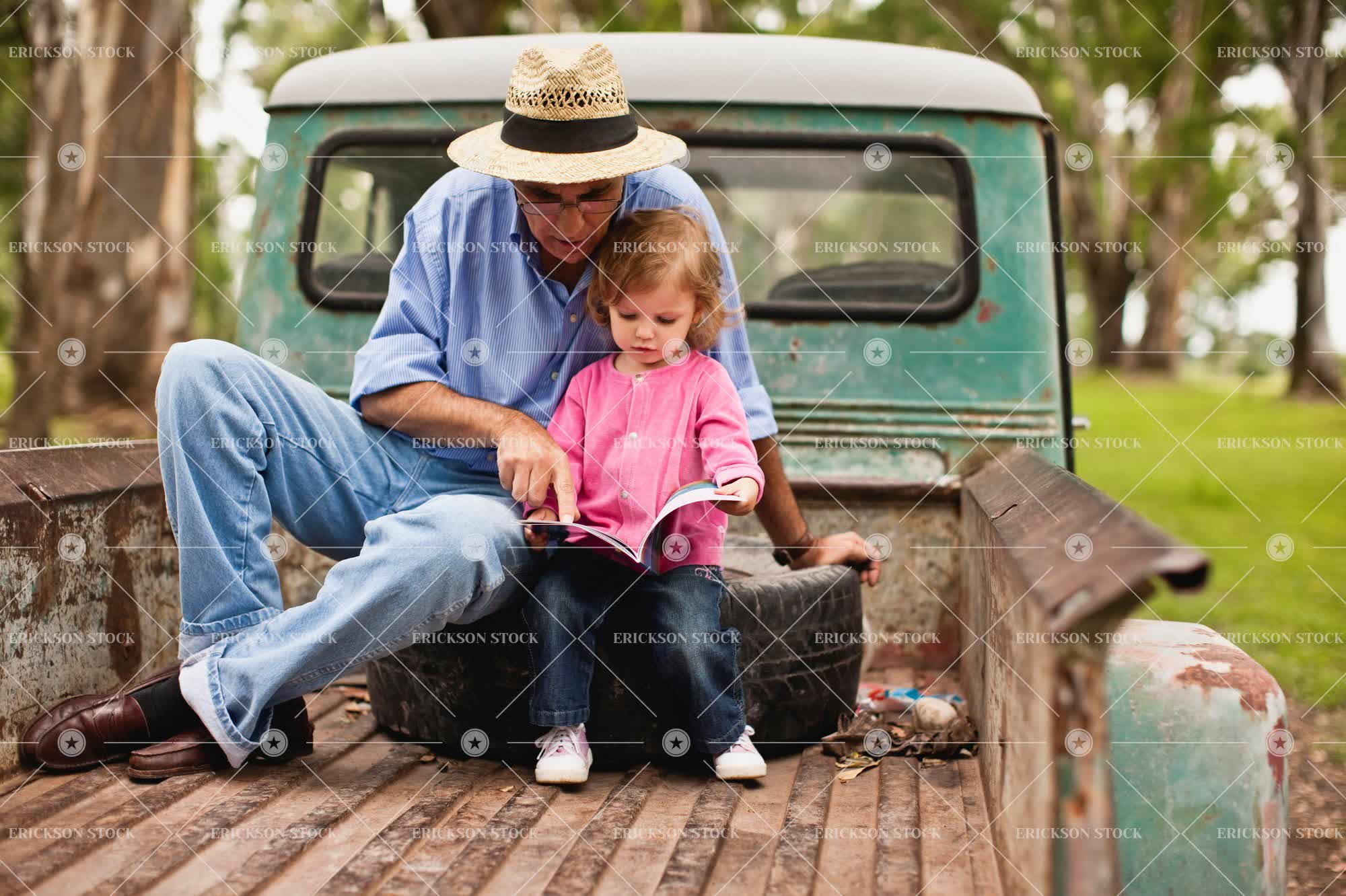 Mature man and his toddler granddaughter reading a picture book in the back of truck.