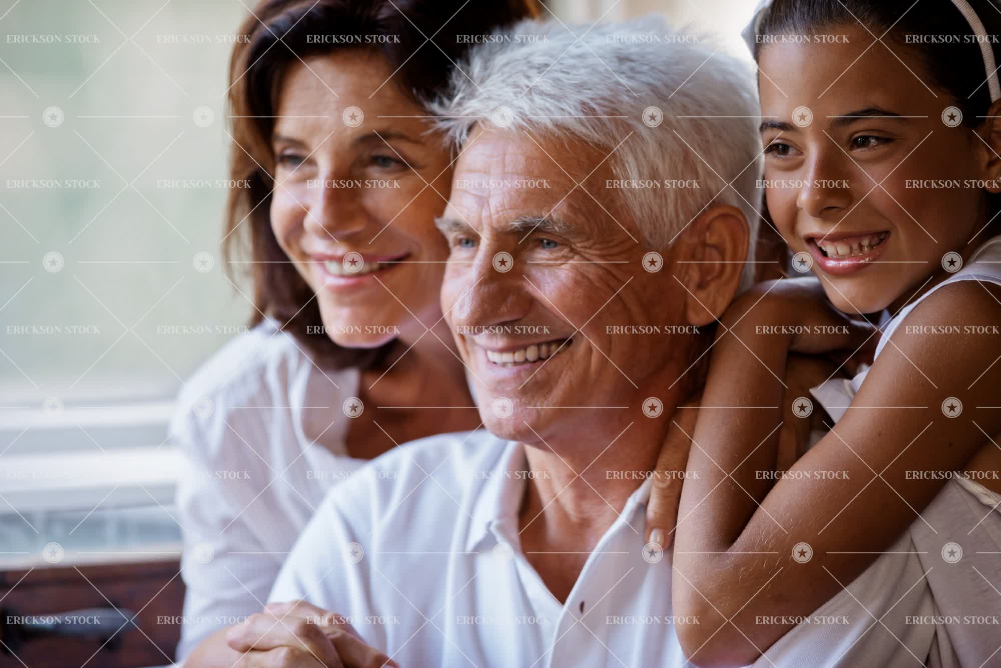 Girl sitting happily with her grandparents, leaning on her grandfather’s shoulder.