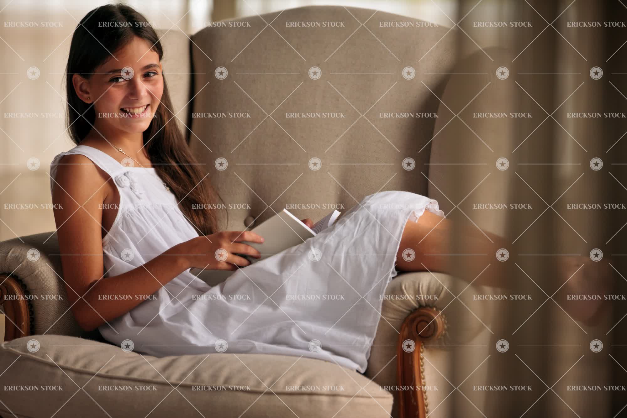 Tags armchair, book, brunette, caucasian, chair, cheerful, child, copy space, country, countryside, day, delight, dress, enjoyment, female, Fun, Furniture, girl, girls, happiness, happy, having fun, home interior, home interiors, horizontal, indoor, indoors, inside, joy, joyful, kid, kids, leisure, leisure activities, leisure activity, Living room, living rooms, lounge, lounges, negative space, non-urban, one person, people, person, read, reading, recreation, recreational pursuit, recreational pursuits, rural, rural life, seat, seatings, selective focus, sit, sitting, sitting room, sitting rooms, smile, smiling, three quarter length, white