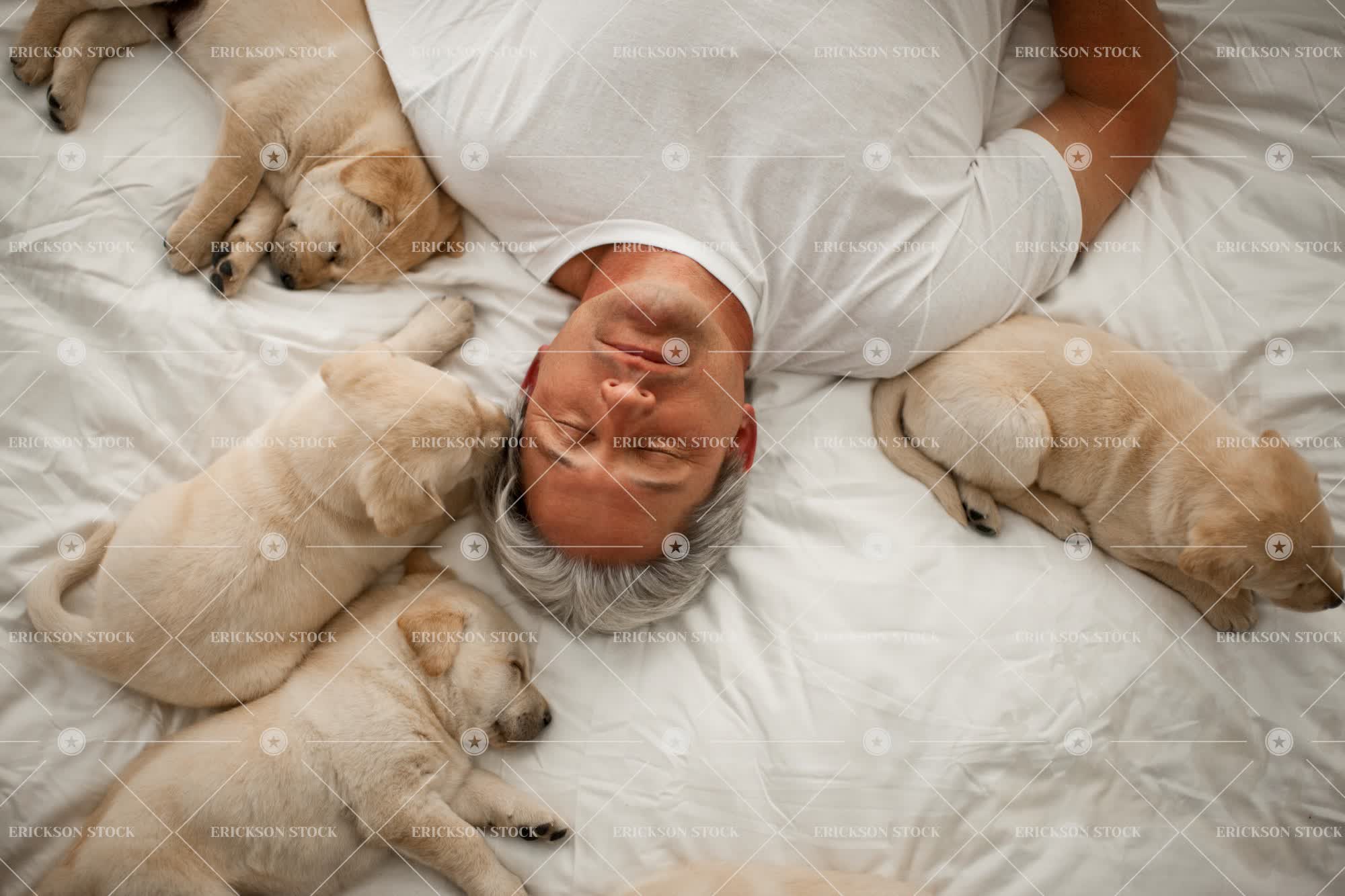 Tags adorable, adult, animal, baby, baby animal, bed, bedclothes, bedroom, blanket, calm, caucasian, close, closed eyes, comfort, comforter, copy space, copy space bottom, cushion, Cute, day, directly above, dog, domestic, duvet, duvets, eyes close, flat, golden labrador, gray hair, grey hair, having a nap, having a rest, having a sleep, head, head & shoulders, head and shoulders, head shot, headshot, high angle, high angle view, home interior, home interiors, horizontal, indoor, indoors, inside, intimacy, intimate, labrador, lie down, lie on back, love, loving, Lying down, lying on back, male, man, mature adult, mid adult, nap, napping, negative space, negative space bottom, one person, overhead, people, person, pet, pets, pillow, pillows, placid, puppies, puppy, relax, Relaxation, relaxed, relaxes, relaxing, rest, Resting, selective focus, sheet, shoulders, sleep, sleeping, sleeps, still, stillness, t-shirt, t-shirts, tee shirt, tee shirts, together, togetherness, tranquil, tranquil scene, tranquility, warm, warmth, white, white bed sheets, young animal