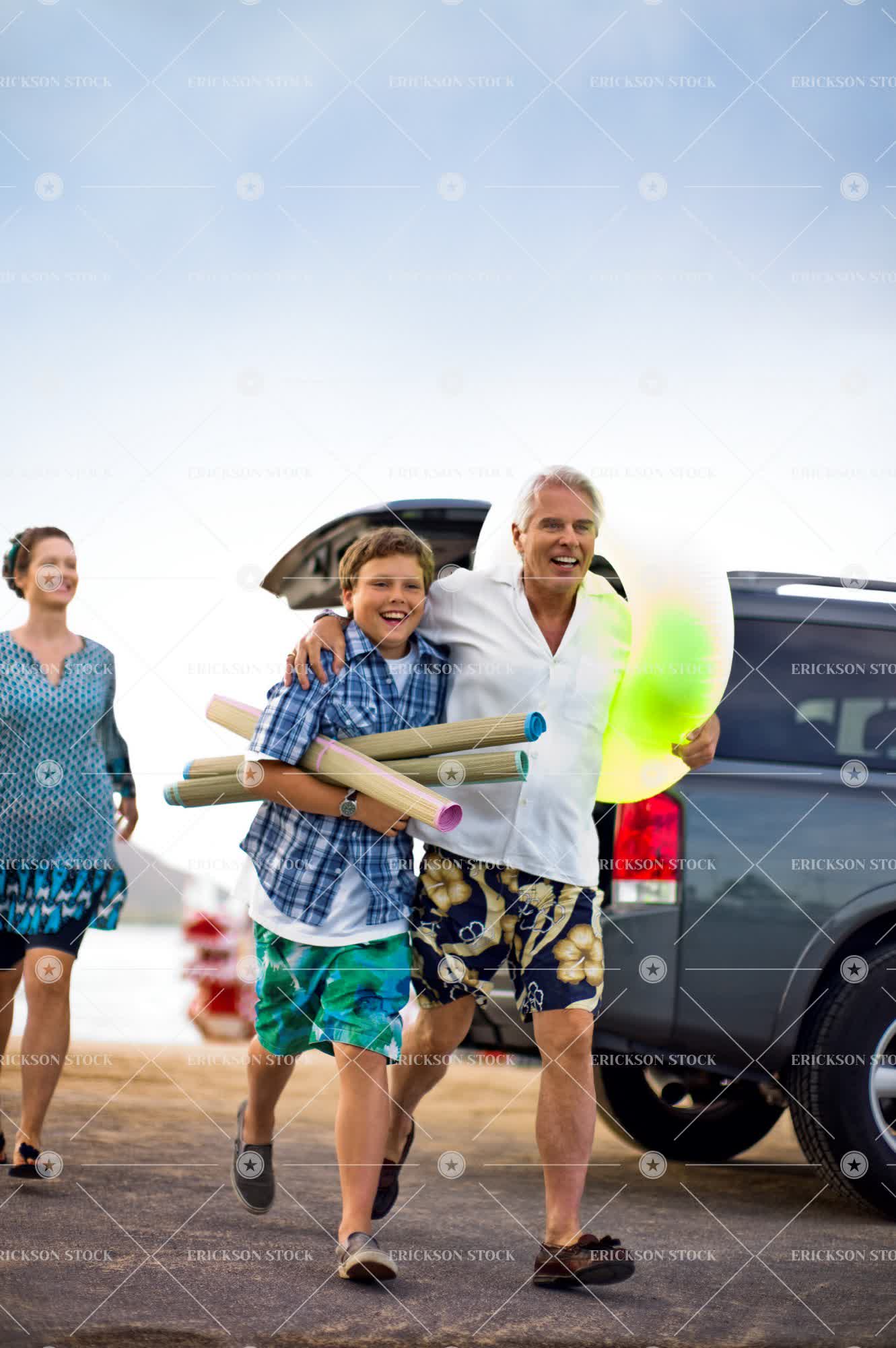 Mature man excitedly arriving to seaside with his son and wife.