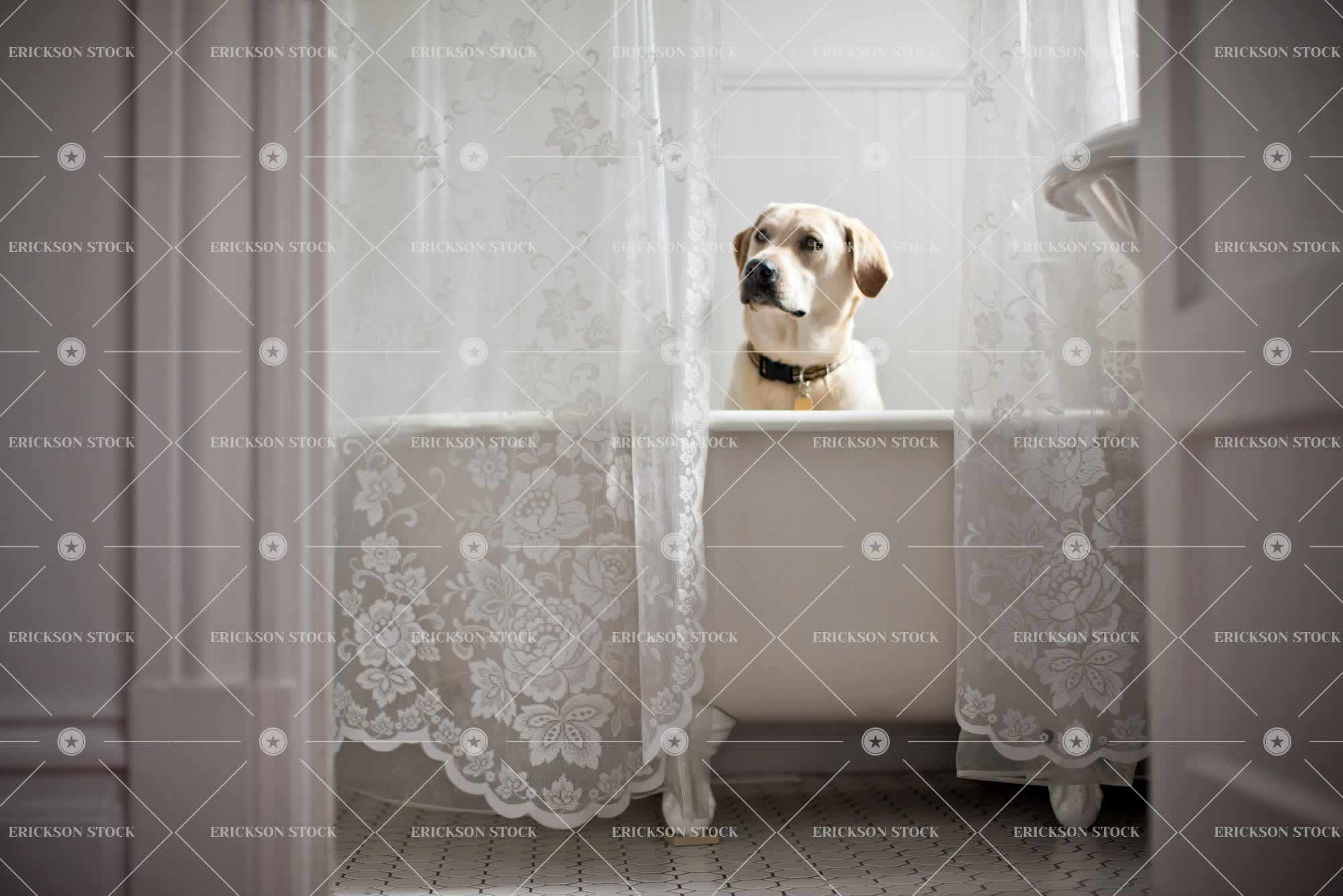 Tags alert, animal, bath, bathe, bathroom, clean, copy space, curtain, dog, domestic, funny, golden labrador, head, headshot, home interior, home interiors, horizontal, Humor, humorous, humour, humourous, Hygiene, hygienic, indoor, indoors, inside, labrador, negative space, nobody, one animal, pet, pets, routine, selective focus, wait, waiting, wash, washes, Washing