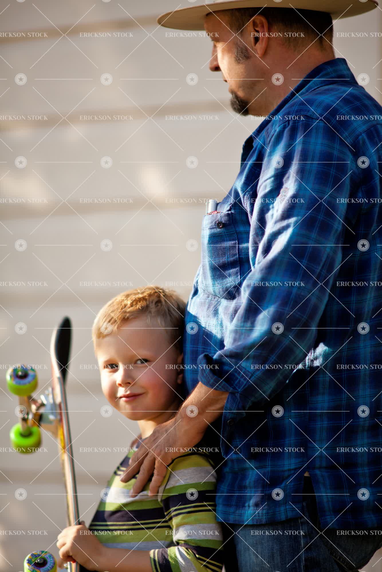 Tags adult, architectural exterior, architecture, blond, blue jeans, boy, building, button down shirt, casual clothes, caucasian, check, checkered, cheerful, child, collared shirt, copy space, day, delight, denim, enjoyment, exterior, Eye contact, family, father, Fun, half length, happiness, happy, hat, hats, having fun, home, homes, house, house exterior, house exteriors, household, households, houses, jeans, joy, joyful, kid, kids, leisure, leisure activities, leisure activity, look at camera, looking at camera, male, man, mature adult, mid adult, negative space, non-urban, outdoor, outdoors, outside, parent, parents, people, person, plaid, recreation, recreational pursuit, recreational pursuits, residence, residences, residential, residential district, residential districts, selective focus, shirt, shirts, skateboard, skateboarder, skateboarders, skateboarding, skateboards, smile, smiling, son, stand, standing, stands, Suburb, suburban, suburbia, suburbs, three quarter length, towhead, two people, vertical, waist up