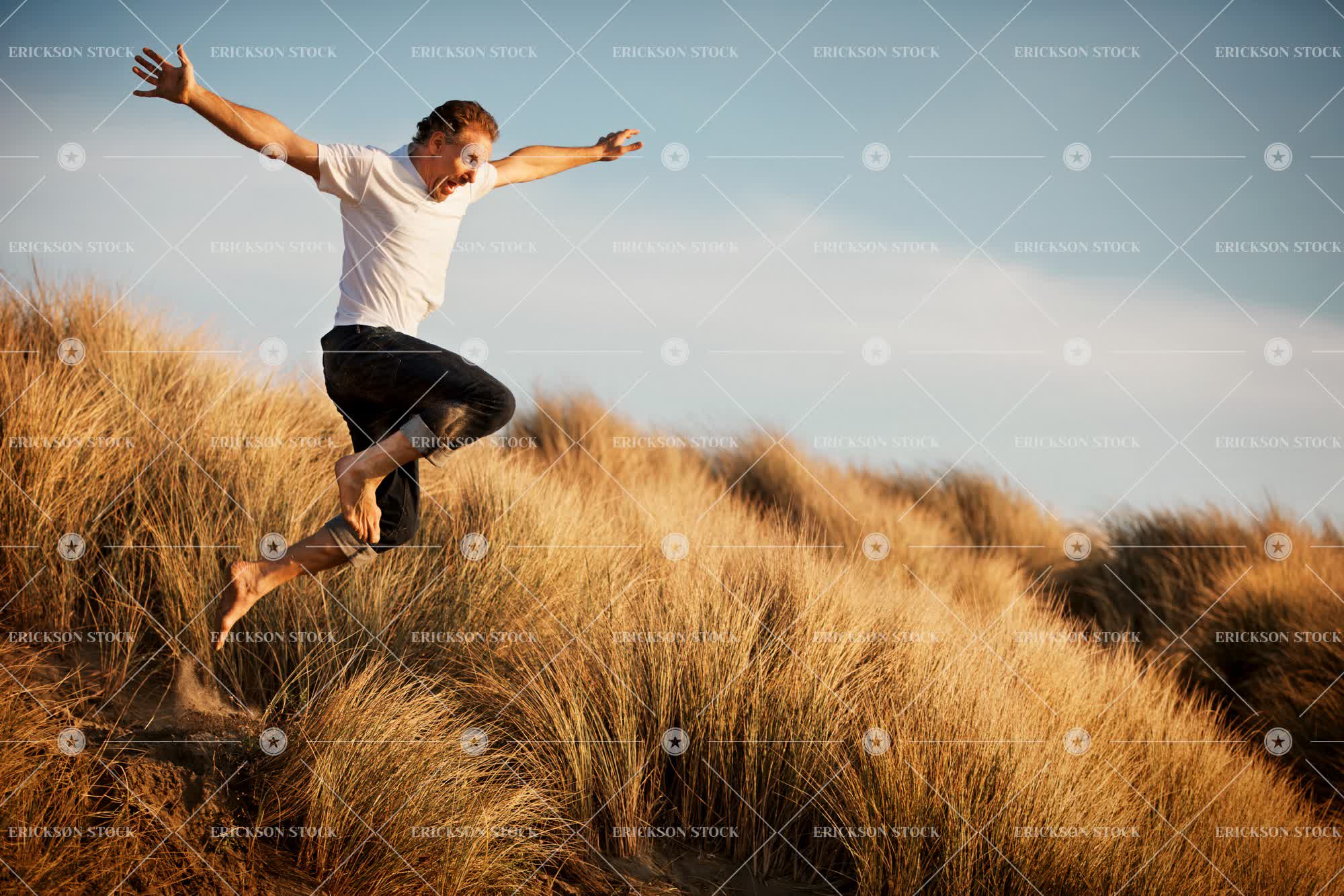 Tags action, active, adult, arm outstretched, arm raised, arms open, barefoot, beach, blue jeans, carefree, casual clothes, caucasian, cheerful, copy space, day, delight, denim, dune, ecstasy, ecstatic, enjoyment, euphoria, euphoric, excited, excitement, free, freedom, full length, Fun, grass, grasses, grassy, grin, grinning, grins, hand raised, hands raised, happiness, happy, having fun, hobbies, hobby, horizontal, jeans, joy, joyful, jump, jumping, leap, leaping, leisure, leisure activities, leisure activity, male, man, mature adult, mid adult, mid-air, midair, motion, moving, negative space, on the move, one person, outdoor, outdoors, outside, people, person, play, Playful, Playing, plays, recreation, recreational pursuit, recreational pursuits, remote, remoteness, sand, sand dune, sand dunes, sandy, selective focus, smile, smiling, t-shirt, t-shirts, tee shirt, tee shirts, toothy smile, tussock, tussock grass, tussock grasses, tussocks, vitality