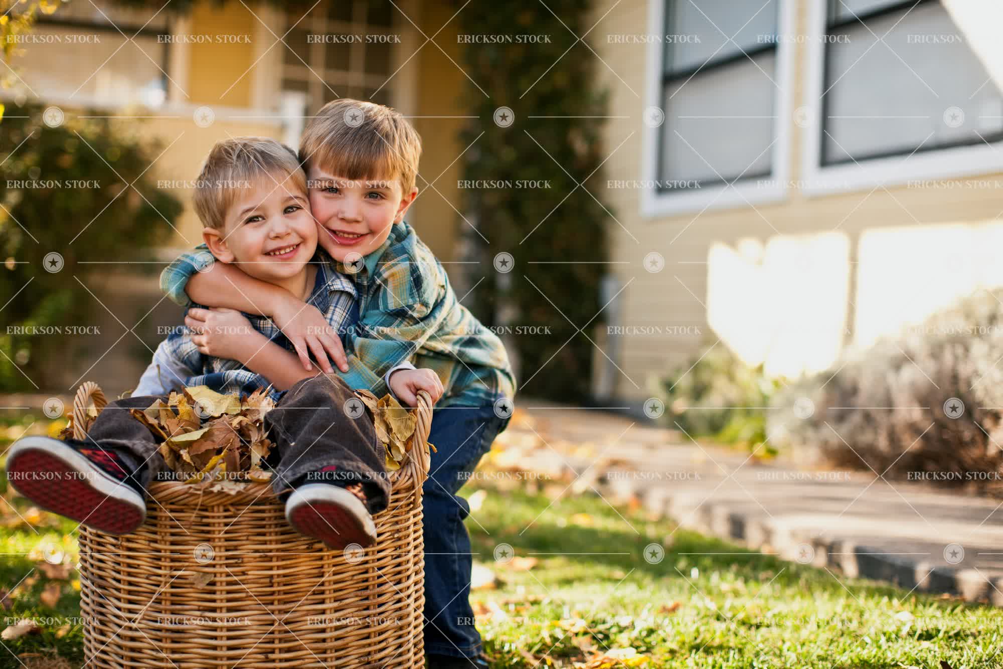 Tags adorable, affectionate, arm around, autumn, backyard, basket, blond, blue jeans, boy, brother, button down shirt, casual clothes, caucasian, check, checkered, cheerful, child, collared shirt, copy space, country, countryside, crouch, Cute, day, delight, denim, embrace, embracing, enjoyment, Eye contact, fall, falling, falling leaves, falls, front or back yard, frontyard, frontyards, full length, Fun, garden, gardens, grass, grassy, green, greenery, happiness, happy, having fun, horizontal, hug, hugging, jeans, joy, joyful, kid, kids, lawn, leaf, leafy, leaves, leisure, leisure activities, leisure activity, look at camera, looking at camera, male, natural, nature, negative space, non-urban, outdoor, outdoors, outside, people, person, plaid, recreation, recreational pursuit, recreational pursuits, rural, rural life, selective focus, shirt, shirts, sibling, siblings, sit, sitting, smile, smiling, squat, Squatting, three quarter length, toddler, towhead, Tree, trees, two people