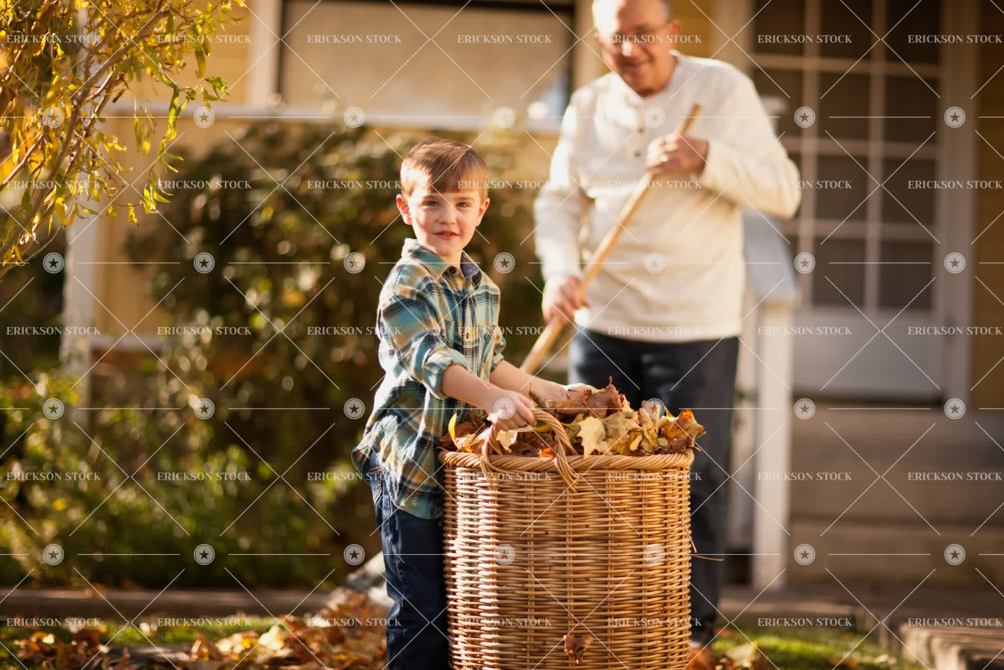 Tags assist, autumn, backyard, basket, blue jeans, boy, building, care, casual clothes, caucasian, checkered, cheerful, child, chore, copy space, cropped, day, delight, denim, domestic, duties, duty, enjoyment, Eye contact, eyeglasses, fall, falling, falling leaves, falls, family, front or back yard, frontyard, frontyards, Fun, garden, gardens, gathering leaves, glasses, grandchild, grandchildren, grandfather, grandfathers, grandparent, grandparents, grandson, grandsons, grass, happiness, happy, having fun, help, helping, home, homes, horizontal, house, house exterior, house exteriors, household, households, houses, jeans, joy, joyful, kid, kids, lawn, leaf, leaves, leisure, leisure activities, leisure activity, look at camera, looking at camera, low angle, low angle view, lumberjack shirt, male, midsection, negative space, outdoor, outdoors, outside, part of, people, person, plaid shirt, rake, rakes, raking, recreation, recreational pursuit, recreational pursuits, residence, residences, residential, residential district, residential districts, selective focus, shirt, shirts, smile, smiling, spectacles, Suburb, suburban, suburbia, suburbs, sweatshirt, sweatshirts, three quarter length, two people