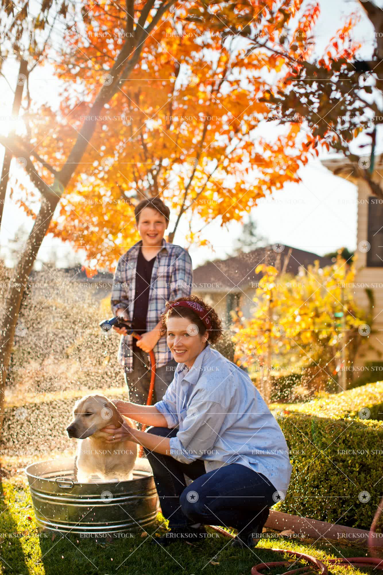 Portrait of a mid-adult woman and her son giving their dog a bath in the backyard.