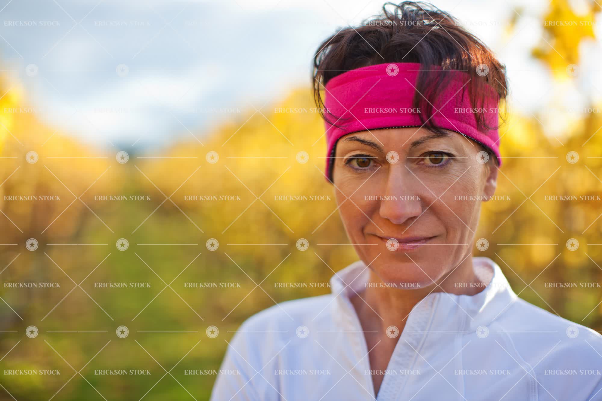 Portrait of a mid adult woman wearing a pink sweat band on her head.