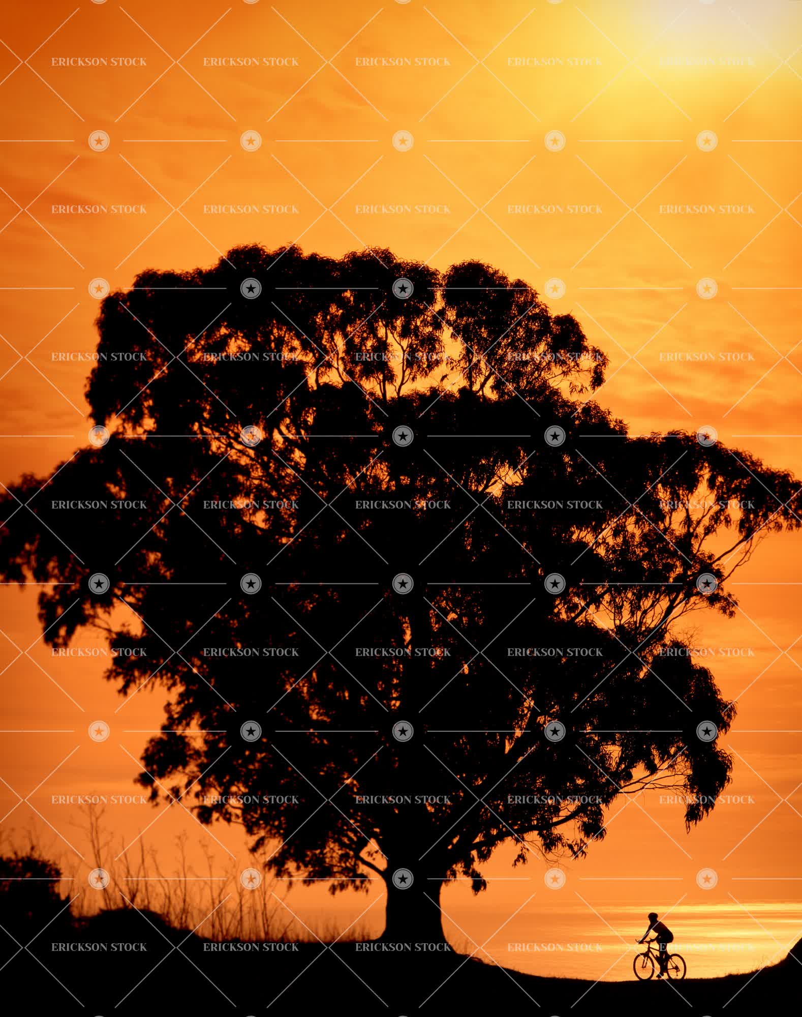 Beautiful view of cyclist riding past large silhouetted tree at sunset.