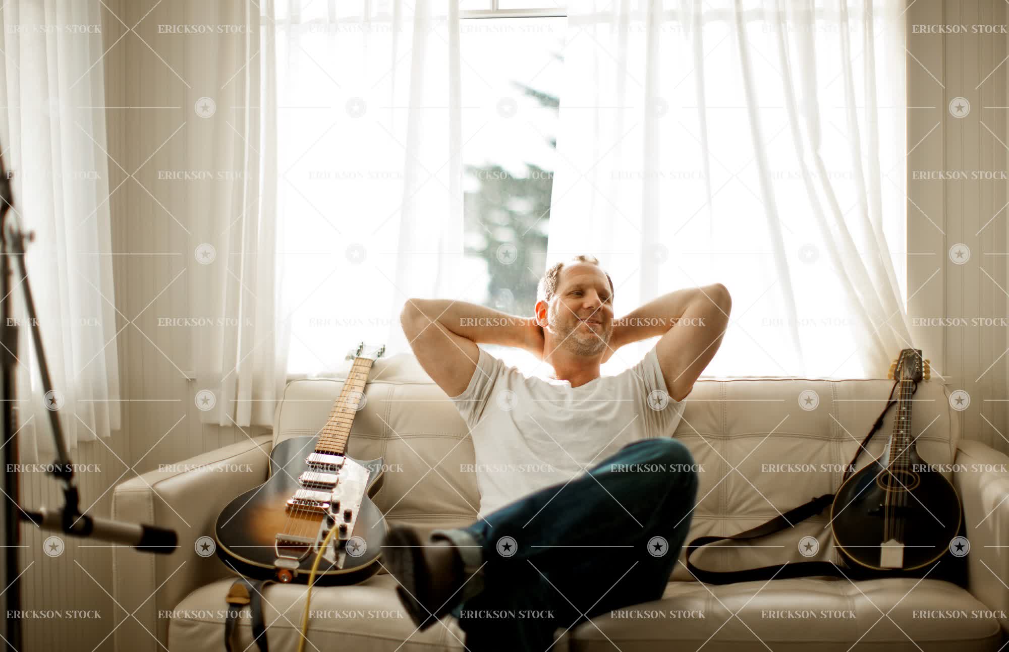 Tags acoustic guitar, adult, blue jeans, casual clothes, caucasian, cheerful, comfort, copy space, couch, day, delight, denim, electric guitar, electric guitars, enjoyment, facial hair, Fun, Furniture, Guitar, guitar player, guitar players, Guitarist, guitarists, guitars, hand behind head, hands behind head, happiness, happy, having fun, hobbies, hobby, home, home interior, home interiors, homes, horizontal, house, house interior, house interiors, houses, indoor, indoors, inside, instrument, instruments, interior, interiors, jeans, joy, joyful, leisure, leisure activities, leisure activity, Living room, living rooms, look away, looking away, lounge, lounge suite, lounge suites, lounges, male, man, microphone, microphones, mid adult, Music, Musical instrument, musical instruments, Musician, musicians, negative space, one person, people, person, recreation, recreational pursuit, recreational pursuits, relax, Relaxation, relaxed, relaxes, relaxing, selective focus, settee, sit, sitting, sitting room, sitting rooms, smile, smiling, Sofa, sofas, stubble, t-shirt, t-shirts, tee shirt, tee shirts, three quarter length