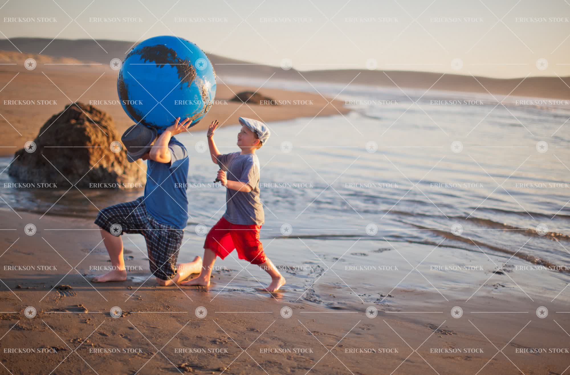 Two brothers playing together with a swiss ball on a beach.