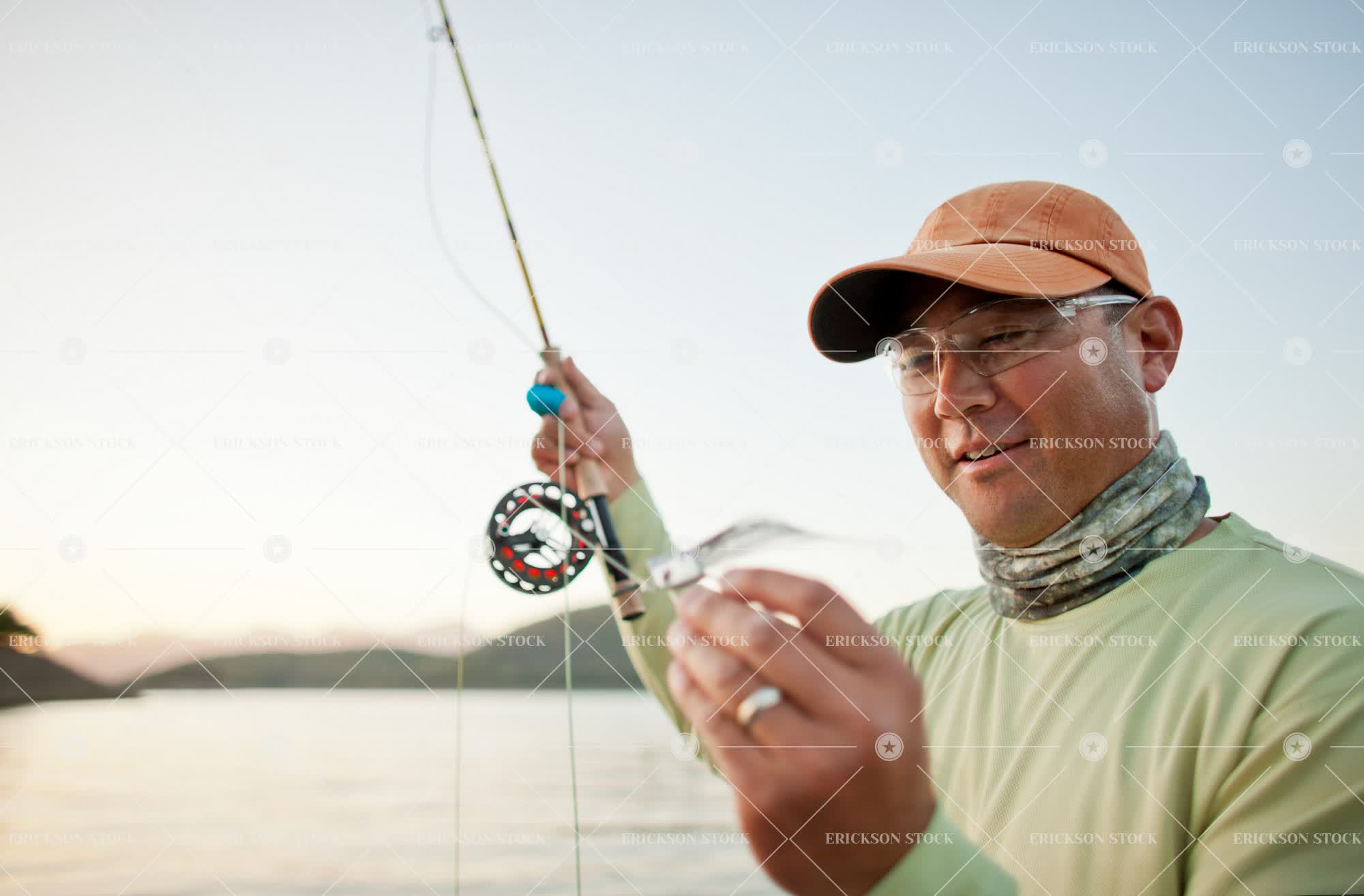 Smiling mid adult man holding a fish hook and fishing rod while fishing on a lake.