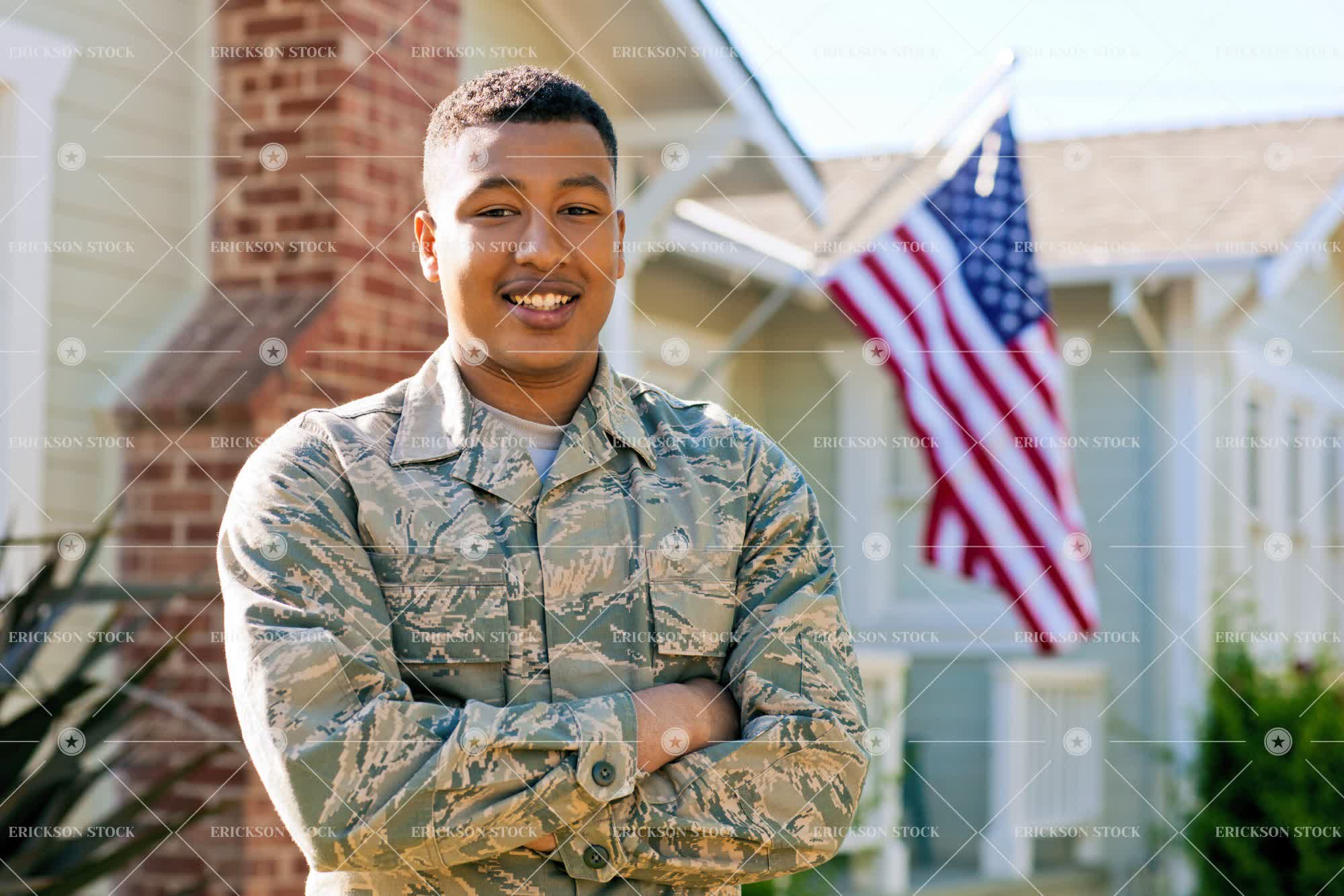 Portrait of a young adult soldier standing with his arms crossed outside his home.