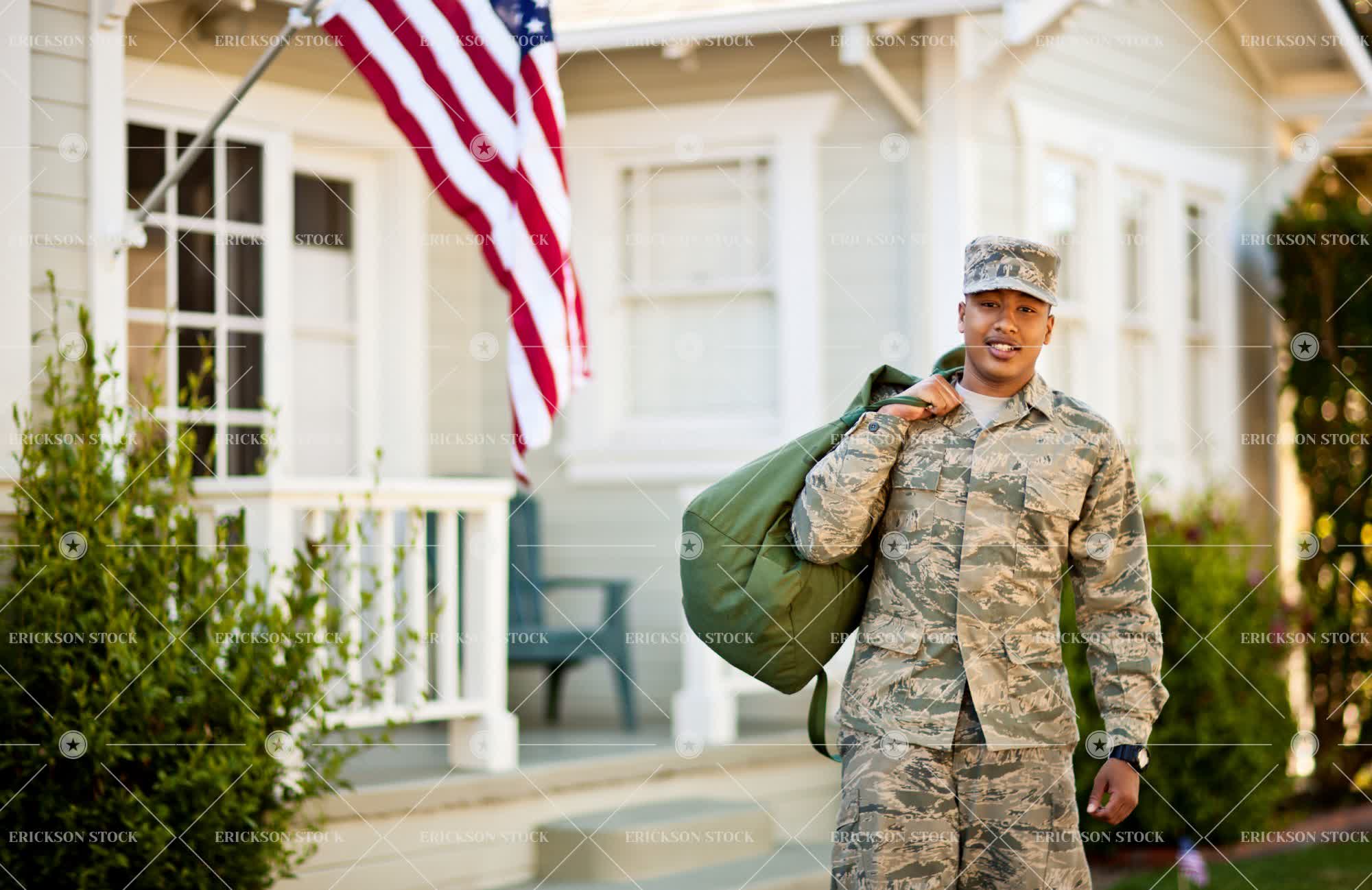 Portrait of a smiling soldier carrying a bag over his shoulder outside his home.