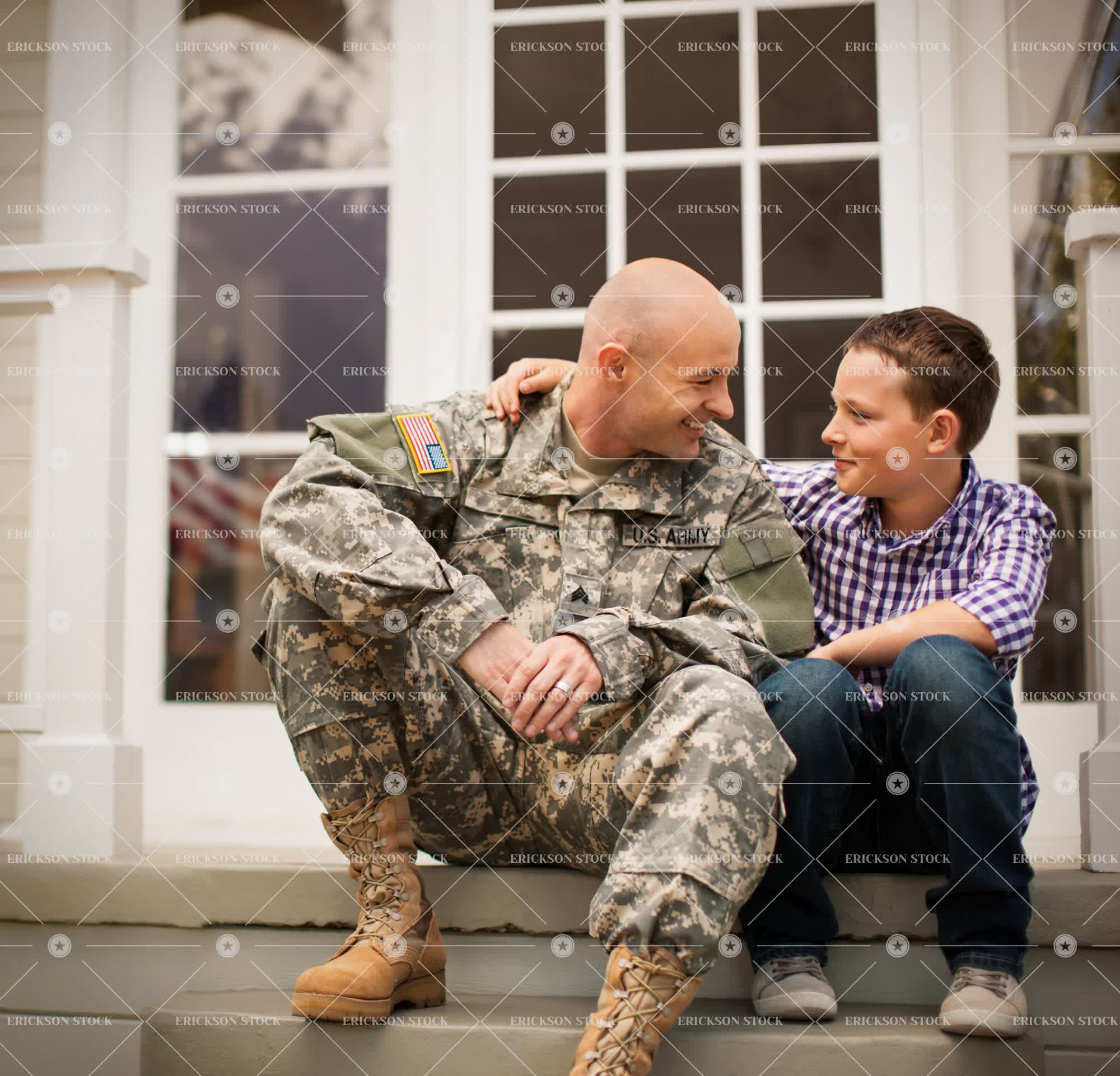 Mid adult man in army uniform sitting on an outdoor stair with his son.