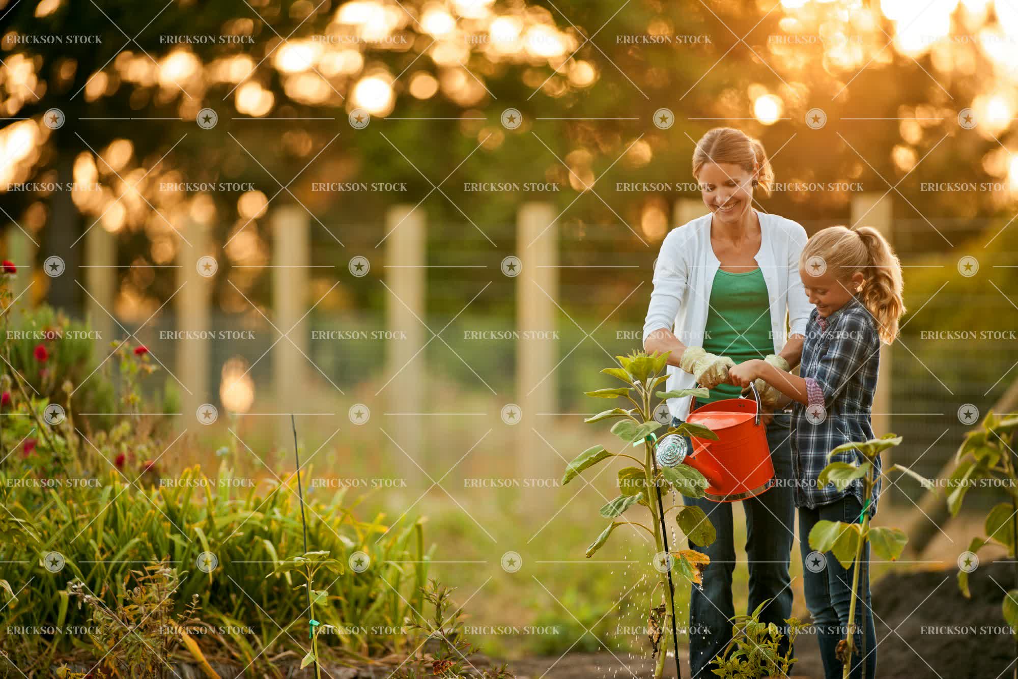 Smiling young girl helping her mother water their garden with a watering can.