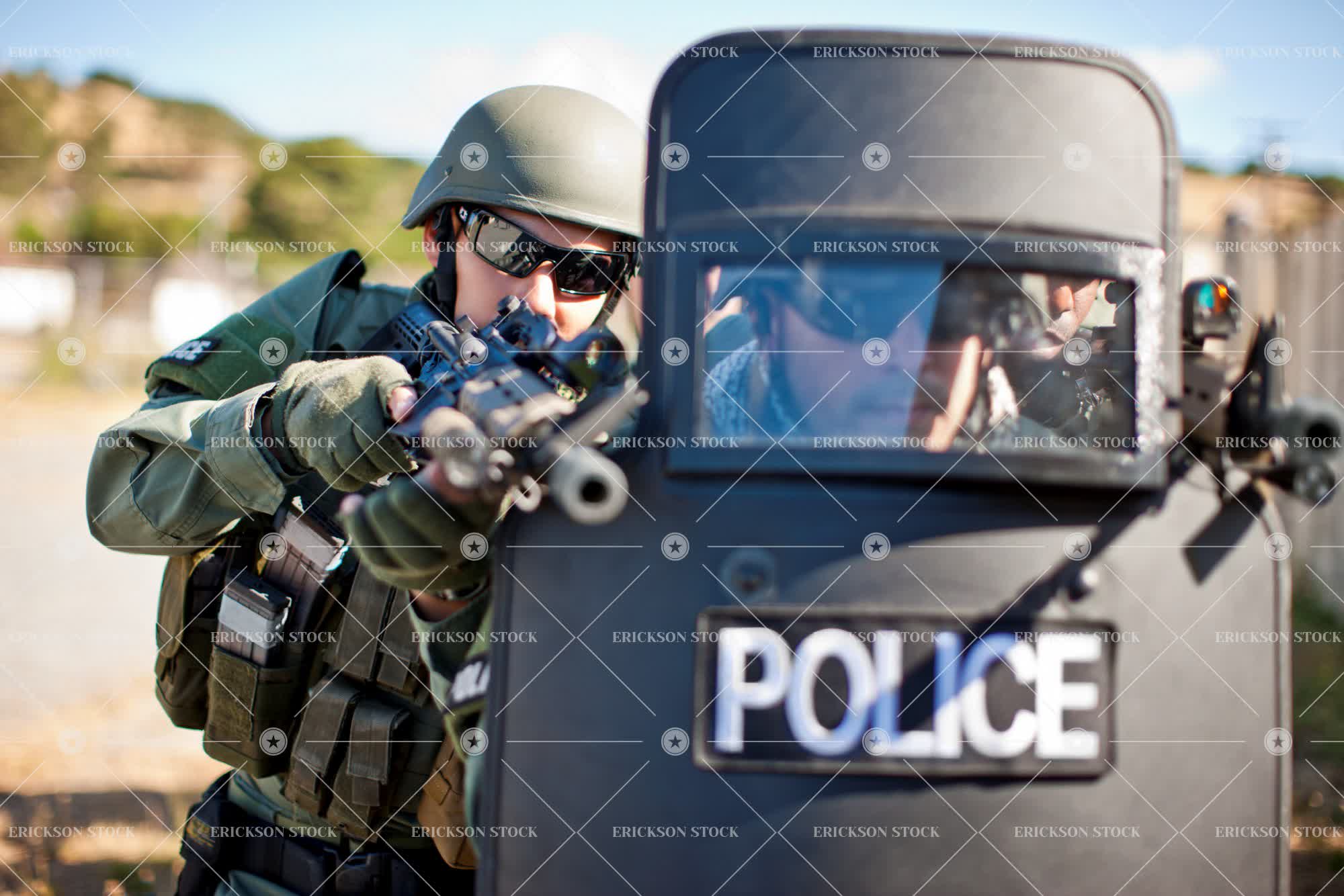 Military policeman aiming guns from behind a police riot shield.