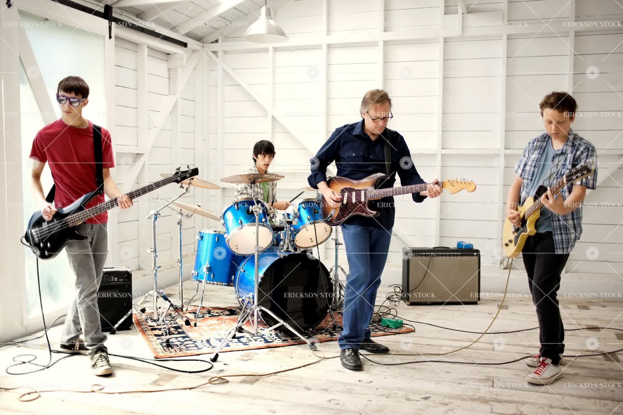 Three teenage boys and a mature man having a jam session on electric guitars and drums