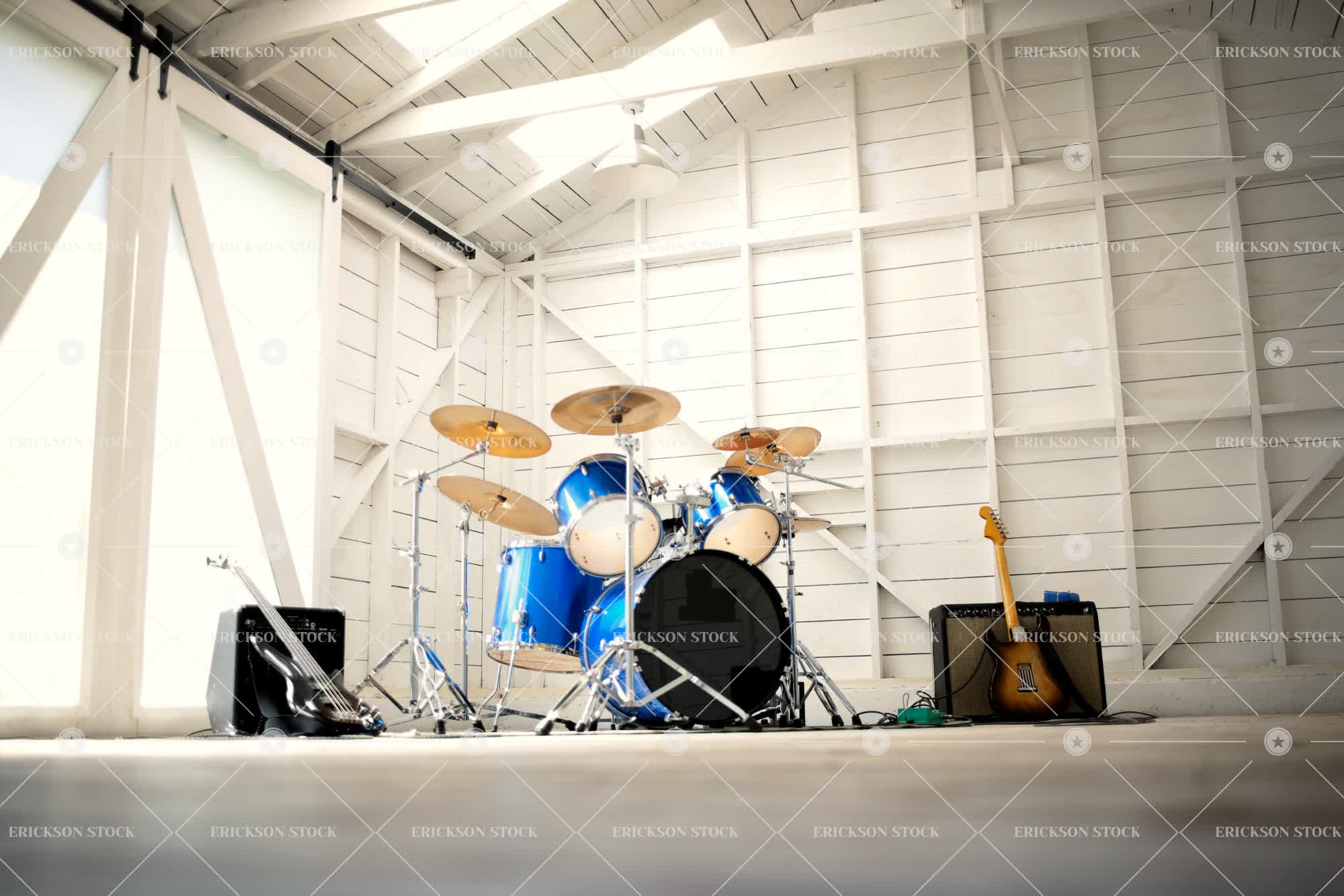 Tags amplifier, audio equipment, bass, bass guitar, cymbal, drum, drum kit, electric guitar, electric guitars, floorboard, floorboards, flooring, garage, garages, Guitar, guitars, hardwood floor, hobbies, hobby, horizontal, indoor, indoors, inside, instrument, instruments, interior, interiors, lamp, leisure, leisure activities, leisure activity, low angle, Music, Musical instrument, musical instruments, nobody, practice studio, recreation, recreational pursuit, recreational pursuits, rehearsal space, Room, Rooms, selective focus, sunlight, sunny, sunshine, window, windows, wood, wooden