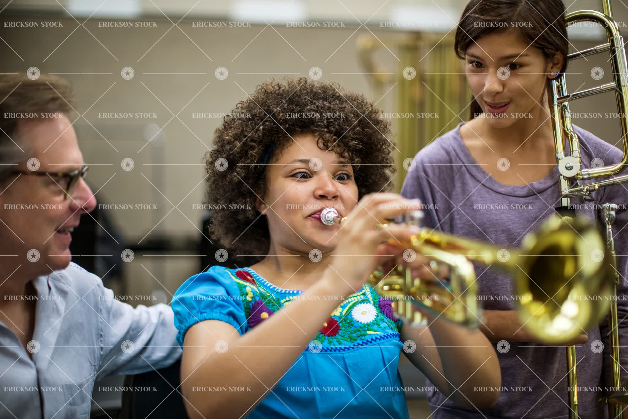 Tags adult, african american, afro, blow, brass instrument, brown eyes, brunette, button down shirt, casual clothes, caucasian, cheerful, child, class, collared shirt, curl, day, delight, discover, Education, enjoyment, eyeglasses, female, focus on foreground, friend, friends, friendship, girl, girls, glasses, gray hair, grey hair, half length, happiness, happy, high school, high school student, high school students, high schools, hold, holding, holds, horizontal, indoor, indoors, inside, instruct, instructing, instrument, instruments, joy, joyful, latin american, learn, learning, look away, looking away, male, man, mature adult, mid adult, Music, music class, music classes, Musical instrument, musical instruments, Musician, musicians, people, person, playing instrument, playing instruments, playing musical instrument, playing musical instruments, ponytail, pupil, pupils, ringlet, ringlets, School, schools, selective focus, shirt, shirts, shock, shocked, sit, sitting, smile, smiling, spectacles, student, students, surprise, surprised, teacher, teachers, teaching, teenage girl, teenager, together, togetherness, trombone, trumpet, trumpets, waist up, young adult