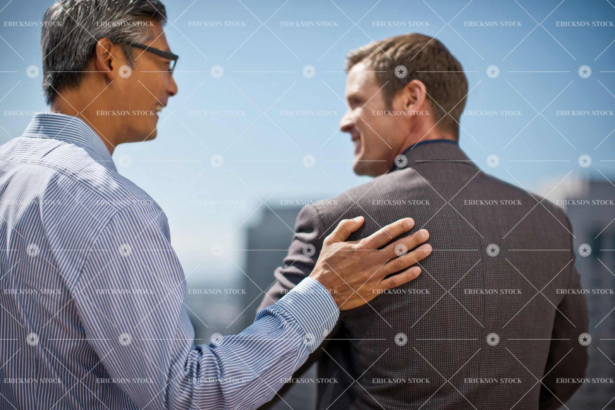 Tags adult, asian, at work, back, back view, blazer, brunette, business, business man, caucasian, cheerful, city, colleague, day, delight, enjoyment, executive, executives, eyeglasses, face to face, facing each other, glasses, gray hair, grey hair, half length, hand on shoulder, hands on shoulders, happiness, happy, horizontal, Jacket, jackets, job, jobs, joy, joyful, looking at each other, male, man, mature adult, mid adult, Networking, next to, occupation, occupations, office worker, office workers, outdoor, outdoors, outside, people, person, place of work, rear, rear view, selective focus, shirt, shirts, side by side, smile, smiling, spectacles, together, togetherness, touching shoulder, two people, urban, urban scene, Urban scenes, waist up, well-dressed, white collar worker, white collar workers, work, worker, workers, working, young adult