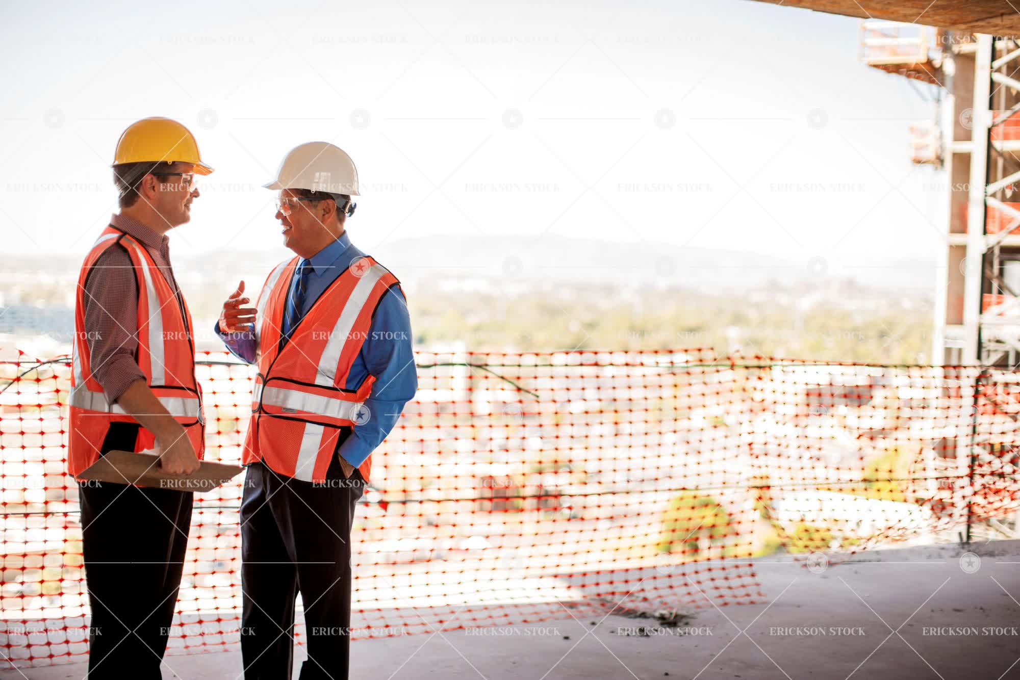 Tags adult, architecture, blueprint, building, business, business man, caucasian, city, colleague, construction, construction site, construction worker, conversation, day, develop, executive, executives, face to face, foreman, hard hats, hardhat, hardhats, helmet, hi-vis vest, high visibility vest, horizontal, incomplete, indoor, indoors, inside, job, latin american, looking at each other, male, man, mature adult, meeting, meetings, mid adult, occupation, orange vest, outdoor, outside, Pants, people, person, Protecting, protection, roof, safe, Safety, safety clothing, safety glasses, safety vest, scaffolding, selective focus, shirt, shirt and tie, shoes, Side view, site, smiling, speak, speaking, speaks, standing, talk, talking, talks, three quarter length, tie, together, trousers, two people, unfinished, well-dressed, work, working