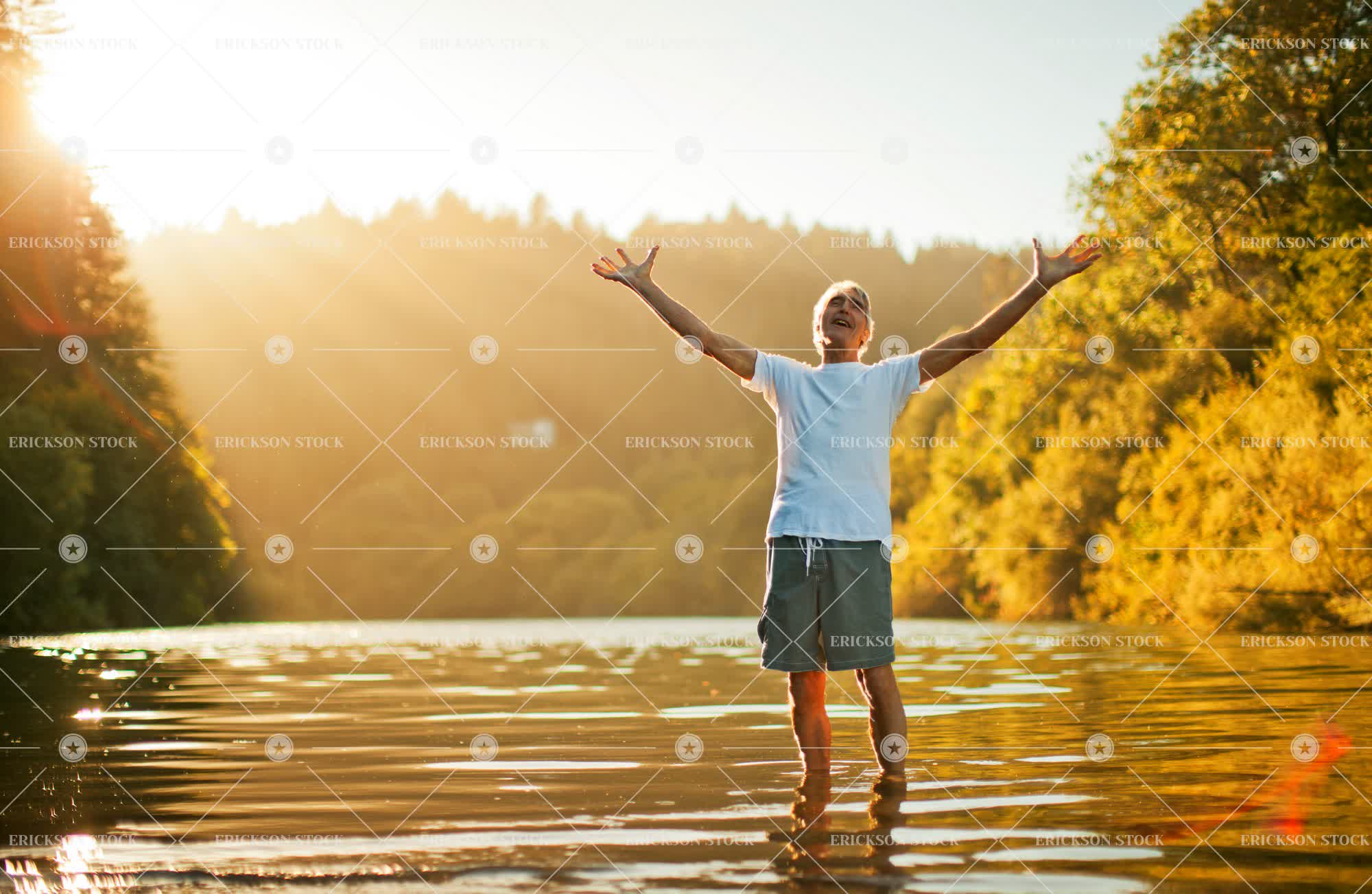 Tags achievement, active, active senior, adult, ankle deep in water, arm outstretched, arm raised, beach, carefree, casual clothes, caucasian, celebrate, cheerful, copy space, day, delight, elderly, enjoyment, excited, expressing positivity, free, freedom, full length, Fun, good news, gray hair, grey hair, grin, grinning, grins, hand raised, hands raised, happiness, happy, having fun, holiday, holidays, horizontal, joy, joyful, Lake, lakes, laughing, leisure, leisure activities, leisure activity, male, man, mature adult, natural, nature, negative space, old, one person, outdoor, outdoors, outside, people, person, pond, ponds, ray, rays, recreation, recreational pursuit, recreational pursuits, reflected, reflecting, Reflection, reflections, reflective, retired, retirement, ripple, rippled, ripples, river, selective focus, senior adult, shore, Shorts, smile, smiling, solar flare, stand, standing, stands, success, successful, Summer, summery, sun, sun flare, sunbeam, sunbeams, sunlight, sunny, sunshine, t-shirt, t-shirts, tee shirt, tee shirts, toothy smile, travel, Vacation, vacations, vitality, wading, waist up, warm, warmth, water, weekend activities, weekend activity