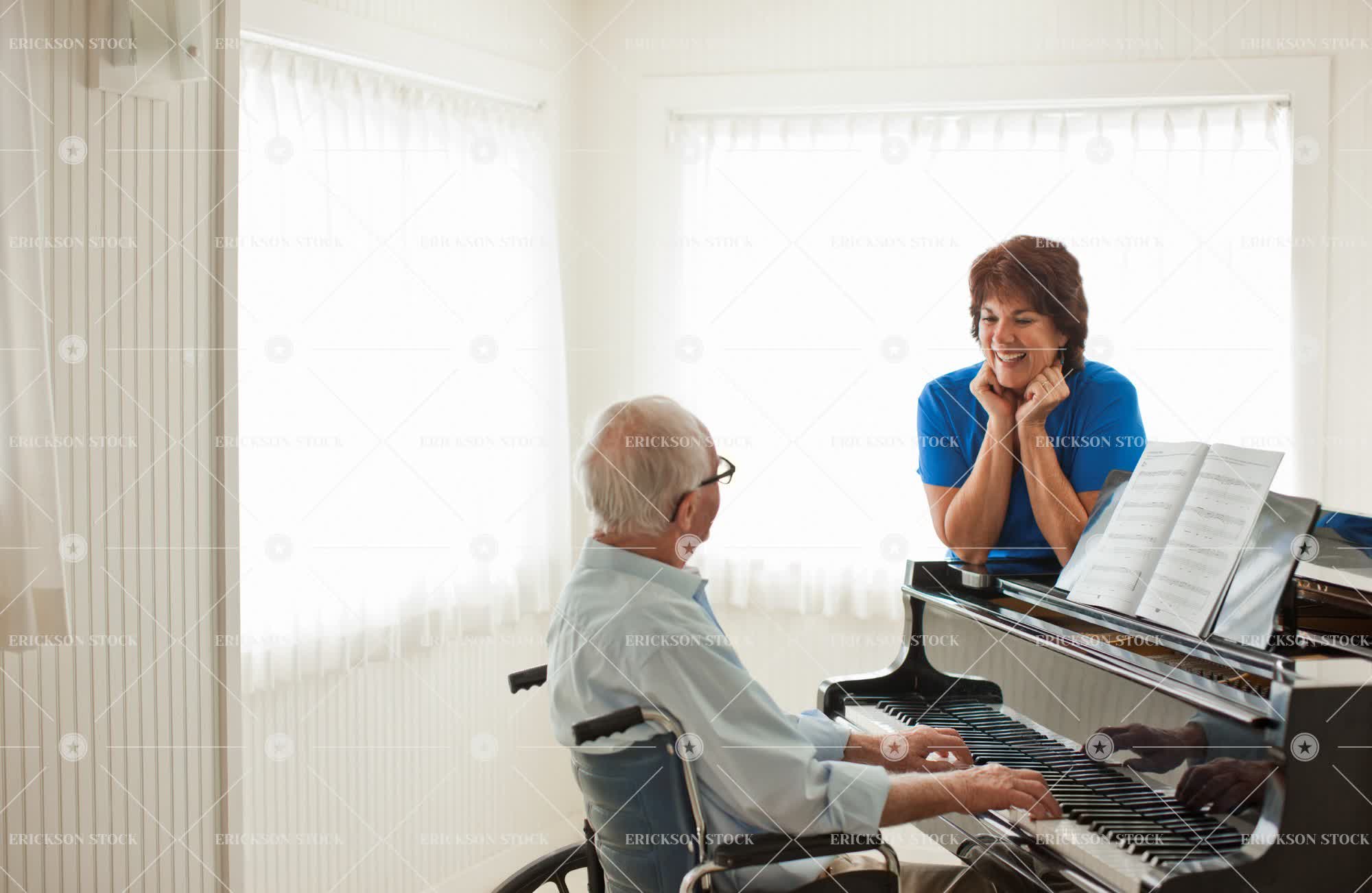 Tags active senior, adult, aging, assist, assisted living, baby grand, brunette, button down shirt, care, caucasian, cheerful, collared shirt, delight, disabled, elderly, enjoyment, eyeglasses, female, friend, friends, friendship, Fun, glasses, golden years, half length, hand on chin, handicapped, happiness, happy, having fun, healthcare, help, helping, hobby, home, home care, home interior, home interiors, homes, horizontal, house, house interior, house interiors, houses, impaired, indoor, indoors, inside, instrument, instruments, interior, interiors, joy, joyful, keys, male, man, mature adult, medicine, mid adult, Music, Musical instrument, musical instruments, Musician, musicians, nurse, nurses, old, one person, people, person, physical impairment, piano, pianos, playing instrument, playing instruments, playing musical instrument, playing musical instruments, retired, retirement, selective focus, senior adult, sheet music, shirt, shirts, sit, sitting, smile, smiling, together, togetherness, two people, uniform, uniforms, vitality, waist up, wheelchair, wheelchairs, woman