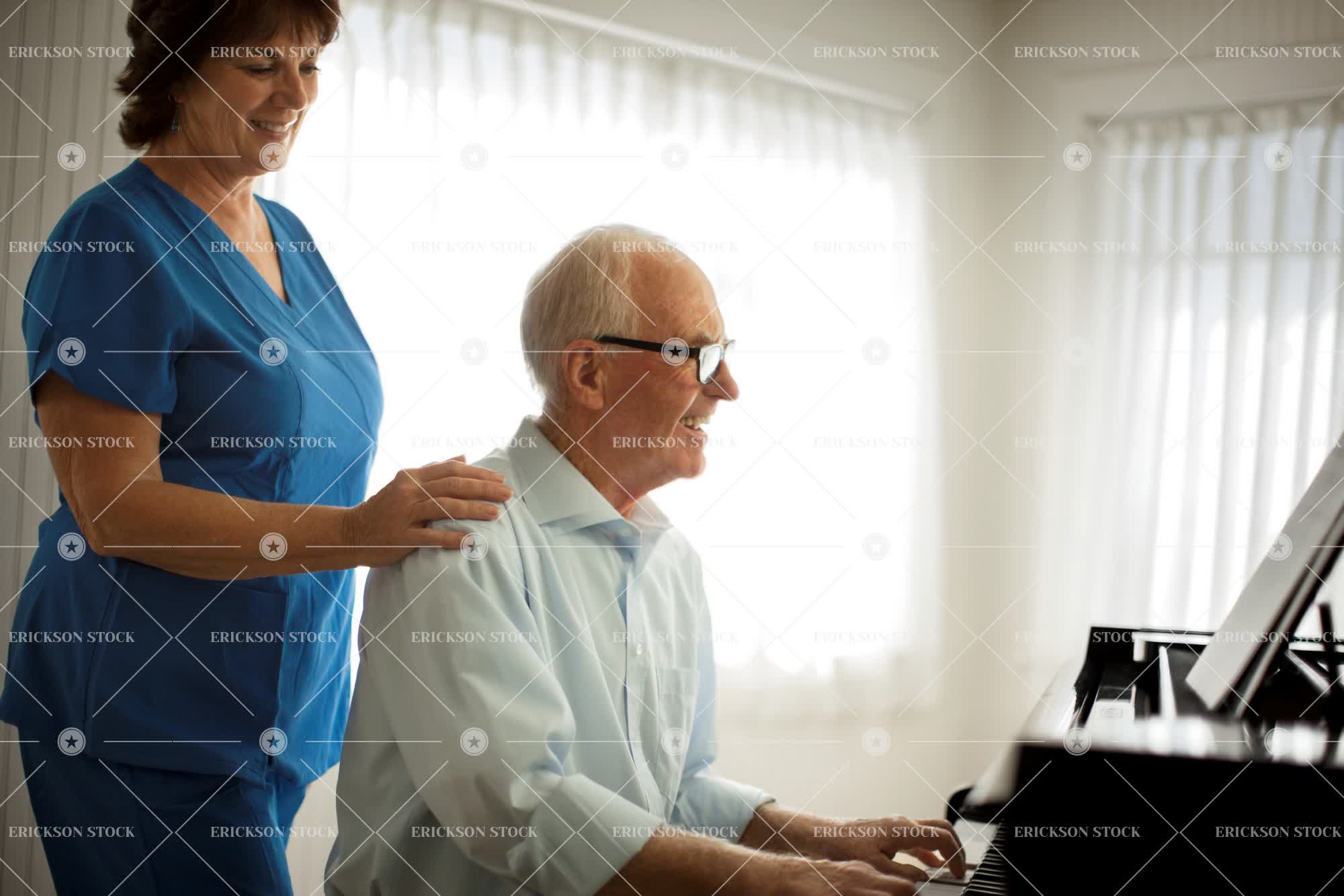 Tags adult, aging, assist, assisted living, baby grand, bond, brunette, button down shirt, care, caucasian, cheerful, coax, collared shirt, copy space, delight, dependency, elderly, encourage, encourages, encouraging, enjoyment, enticing, eyeglasses, female, friend, friends, friendship, Fun, glasses, golden years, gray hair, grey hair, half length, hand on shoulder, hands on shoulders, happiness, happy, having fun, health, healthcare, help, helping, hobby, home, horizontal, ill, illness, indoor, indoors, influence, influences, influencing, inside, instrument, instruments, job, jobs, joy, joyful, lead, leading, leads, leisure, leisure activities, leisure activity, male, man, mature adult, medicine, mid adult, Music, musical, Musical instrument, musical instruments, Musician, musicians, negative space, nurse, nurses, occupation, occupations, old, one person, patient, patients, people, person, persuade, persuades, persuading, persuasion, piano, pianos, playing instrument, playing instruments, playing musical instrument, playing musical instruments, problems, prompt, prompting, prompts, recovery, recreation, recreational pursuit, recreational pursuits, reliant, rest home, resthome, retired, retirement, scrubs, selective focus, senior adult, sheet music, shirt, shirts, short hair, sick, sickness, sitting, smile, smiling, spectacles, standing, Support, supportive, three quarter length, together, togetherness, two people, uniform, uniforms, urge, urges, urging, waist up, woman, work, working