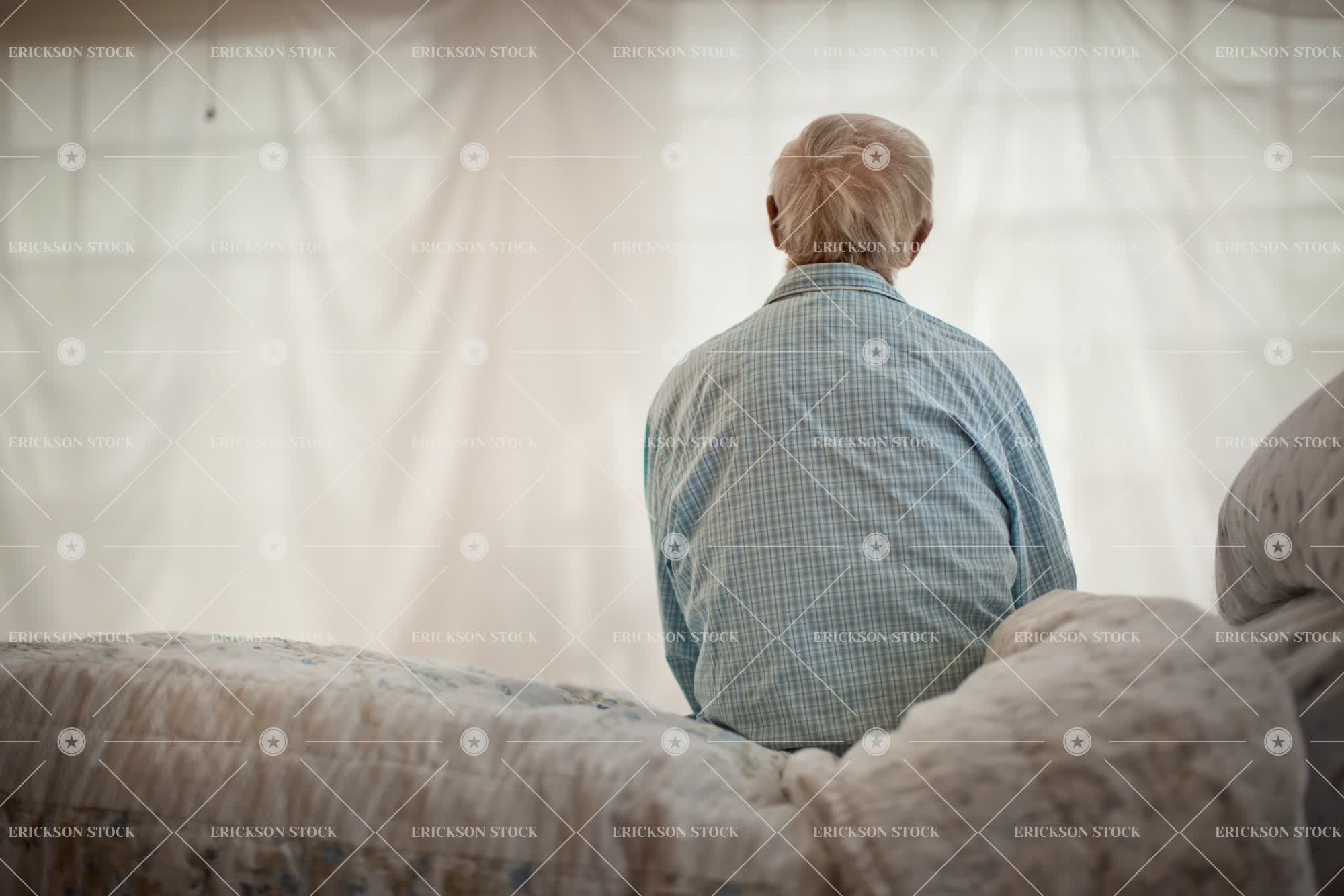 Tags adult, alone, back, back view, bed, bedroom, blanket, caucasian, comfort, comforter, contemplate, copy space, cushion, despair, duvet, duvets, elderly, gloomy, gray hair, grey hair, half length, home interior, home interiors, horizontal, ill, illness, indoor, indoors, inside, Loneliness, lonely, Looking, male, man, mature adult, melancholy, negative space, old, one person, Pajamas, pensive, people, person, pillow, pillows, poorly, pyjama, pyjamas, rear, rear view, recovery, rest home, resthome, sad, sadness, selective focus, senior adult, sick, sickness, sit, sitting, Sleepwear, solitary, solitude, Staring, thinking, thoughtful, unhappiness, unhappy, unhealthy, unwell, waist up, warm, warmth