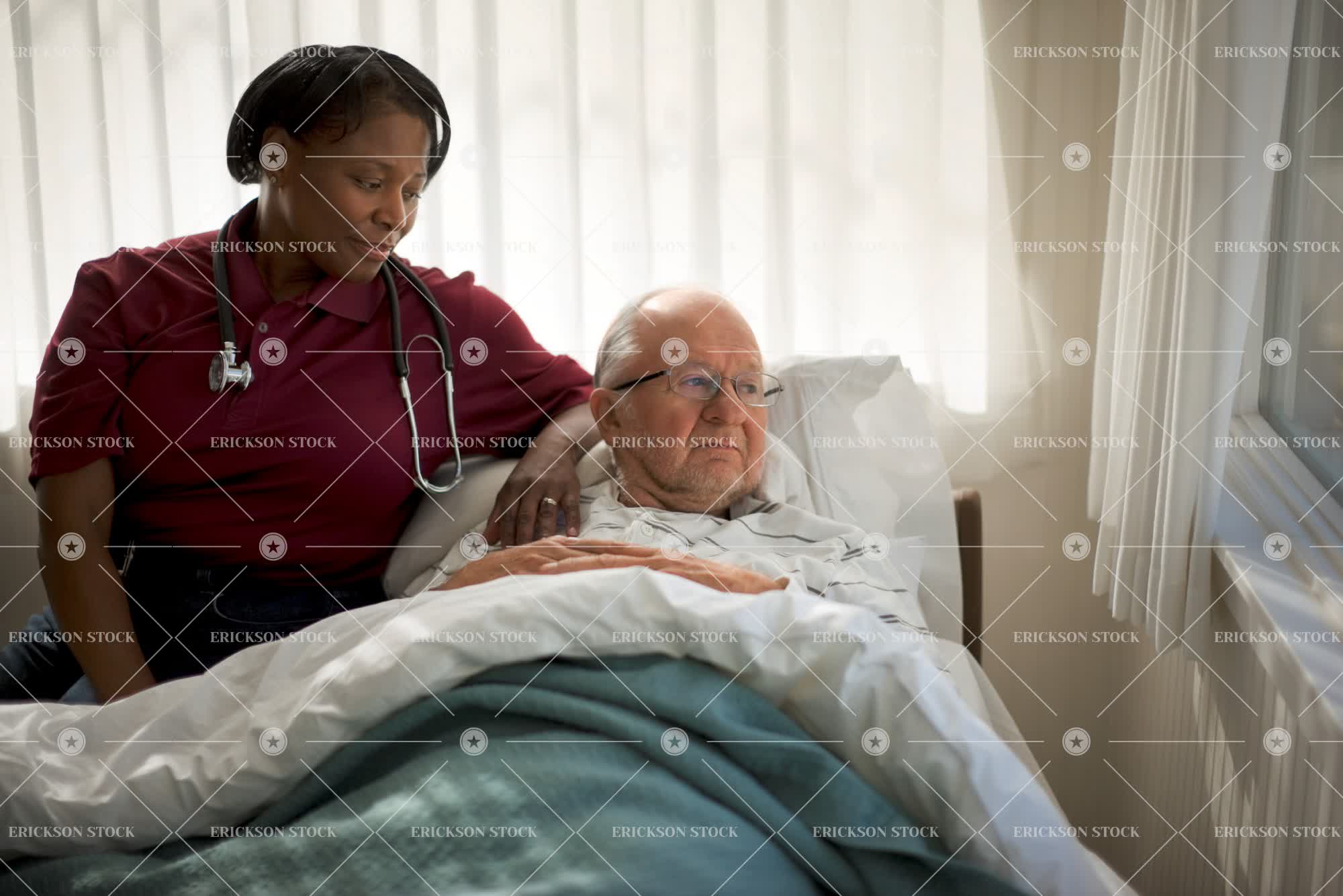 Tags adult, adversity, african american, aging, assist, assisted living, bad news, beard, bed, bedroom, black hair, brunette, care, caregiver, caucasian, comfort, console, contemplate, copy space, cushion, dependency, elderly, emotional stress, eyeglasses, facial hair, female, geriatric, glasses, gloomy, gray hair, grey hair, half length, hand on shoulder, hands on shoulders, head, head & shoulders, head and shoulders, head shot, headshot, health, healthcare, help, helping, home interior, home interiors, horizontal, ill, illness, in bed, indoor, indoors, inside, lie down, look away, look through window, looking away, looking through window, Lying down, lying in bed, male, man, mature adult, medical equipment, medical instrument, medicine, melancholic, melancholy, mid adult, misfortune, negative space, nurse, nurses, nursing, old, patient, patients, pensive, people, person, pillow, pillows, polo shirt, polo shirts, poorly, problem, problems, recovery, Relaxation, relaxed, relaxing, reliant, rest, rest home, resthome, Resting, retired, retirement, retirement home, sad, sadness, selective focus, senior adult, shoulders, sick, sickness, sitting, spectacles, stethoscope, stethoscopes, stress, stressed, stressful, struggle, stubble, talking, thinking, thoughtful, together, togetherness, two people, unhappiness, unhappy, unhealthy, uniform, uniforms, unwell, waist up, window, windows, woman, worried