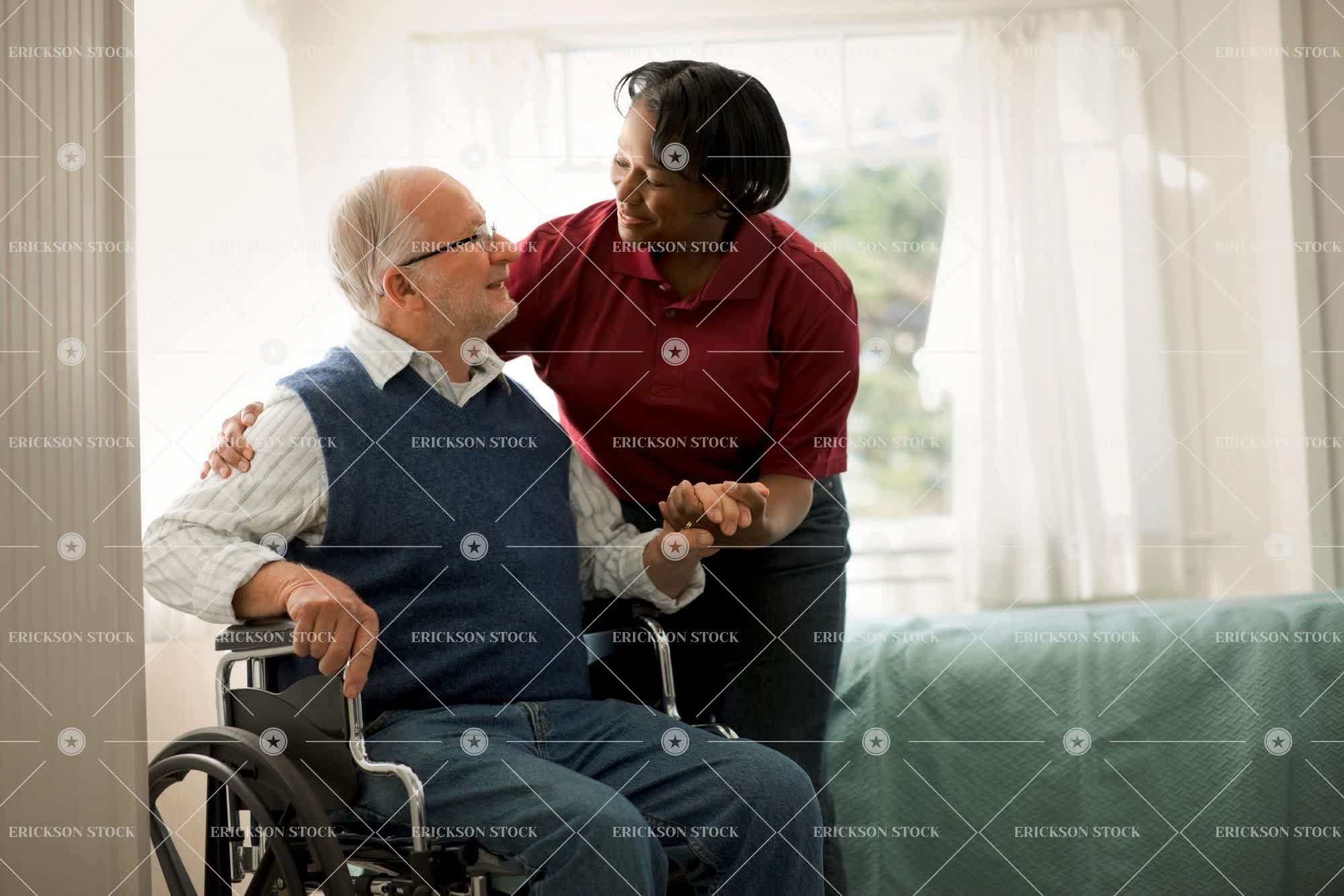 Tags adult, african american, assist, bed, bedroom, black hair, brunette, care, caucasian, cheerful, copy space, delight, dependency, disabled, elderly, enjoyment, expressing positivity, eyeglasses, face to face, facial hair, facing each other, female, Fun, glasses, gray hair, grey hair, hand in hand, handicapped, happiness, happy, having fun, health, healthcare, help, helping, hold hand, hold hands, holding hand, Holding hands, home interior, home interiors, horizontal, ill, illness, indoor, indoors, inside, joy, joyful, looking at each other, male, man, mature adult, medicine, mid adult, negative space, nurse, nurses, old, patient, patients, people, person, physical impairment, polo shirt, polo shirts, poorly, positive, positivity, problems, recovery, reliant, rest home, resthome, selective focus, senior adult, shirt, shirts, sick, sickness, sit, sitting, smile, smiling, spectacles, stubble, three quarter length, two people, unhealthy, uniform, uniforms, unwell, vest, vests, wheelchair, wheelchairs, woman