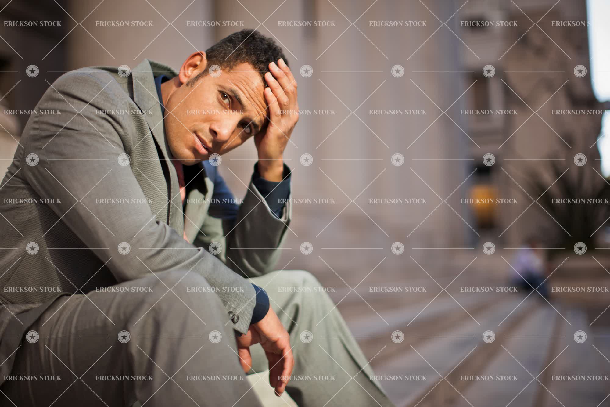 Tags adult, adversity, anxious, bad news, brunette, business, business attire, business man, city, contemplate, day, downtown, emotional stress, executive, executives, gloomy, head in hand, head in hands, horizontal, male, man, melancholy, mid adult, misfortune, mixed race, mixed race person, outdoor, outdoors, outside, pensive, problem, problems, professional, sad, sadness, selective focus, shirt, shirt and tie, sit, sitting, stress, stressed, stressful, struggle, suit, suit coat, thinking, thoughtful, three quarter length, tie, trouble, troubled, unhappiness, unhappy, urban, urban scene, urban setting, well-dressed, white collar, worried, worries, worry, young adult