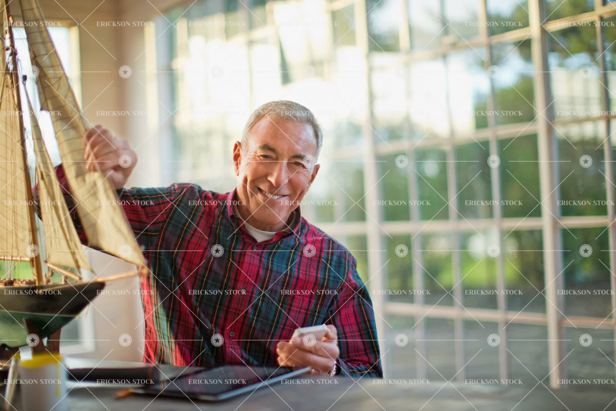 Tags adult, artistic, backlit, boat, building, button down shirt, casual clothes, caucasian, cell phone, checkered, cheerful, collared shirt, communicate, concentrate, connect, construction, copy space, craft, create, delight, digital tablet, e-mail, e-mailing, elderly, email, emailing, enjoyment, Eye contact, eyeglasses, Fun, garage, garages, glasses, gray hair, grey hair, half length, happiness, happy, having fun, hive of industry, hobbies, hobby, horizontal, indoor, indoors, inside, internet, ipad, ipads, joy, joyful, leisure, leisure activities, leisure activity, look at camera, looking at camera, lumberjack shirt, making, male, man, manufactory, manufacturing, mature adult, mobile phone, model, model boat, model boats, model ship, nautical vessel, nautical vessels, negative space, nostalgia, nostalgic, old, one person, people, person, plaid shirt, portrait, Portraits, recreation, recreational pursuit, recreational pursuits, retired, retirement, Sailboat, selective focus, senior adult, shed, sheds, shirt, shirts, short hair, smartphone, smile, smiling, studio, studios, table, technology, Toy, toy boat, toy boats, waist up, wireless, wireless technology, workbench, workroom, workrooms, works, workshop, workshops