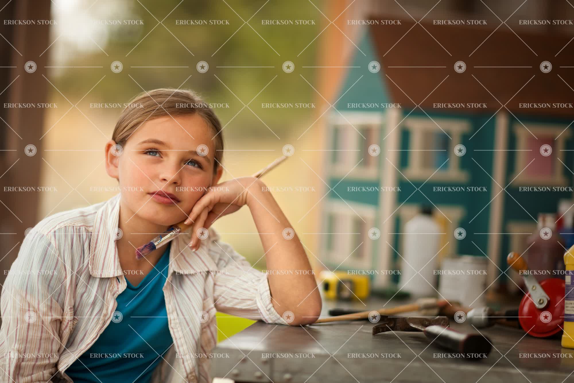 Tags art class, art student, artistic, arts and crafts, blond, blue eyes, brunette, caucasian, child, contemplate, copy space, craft, create, daydream, doll house, elementary age, female, Fun, garage, garages, girl, girls, hair pulled back, hair tied up, half length, hammer, hammers, hand on chin, hand tool, hand tools, happiness, happy, having fun, hobby, hold, holding, holds, horizontal, Imagination, imagining, indoor, indoors, inside, inspiration, kid, kids, leaning, leisure, leisure activities, leisure activity, look up, looking away, looking up, making, manufactory, manufacturing, model house, model houses, negative space, one person, paint, paint brush, paint brushes, paintbrush, paintbrushes, painting, paints, pensive, people, person, ponytail, portrait, pre-adolescent, pre-adolescents, Pre-teen, pre-teens, preteen, preteens, recreation, recreational pursuit, recreational pursuits, selective focus, shed, sheds, studio, studios, table, teenager, thinking, thoughtful, tools, tween, waist up, weekend activities, weekend activity, work bench, workroom, workrooms, works, workshop, workshops