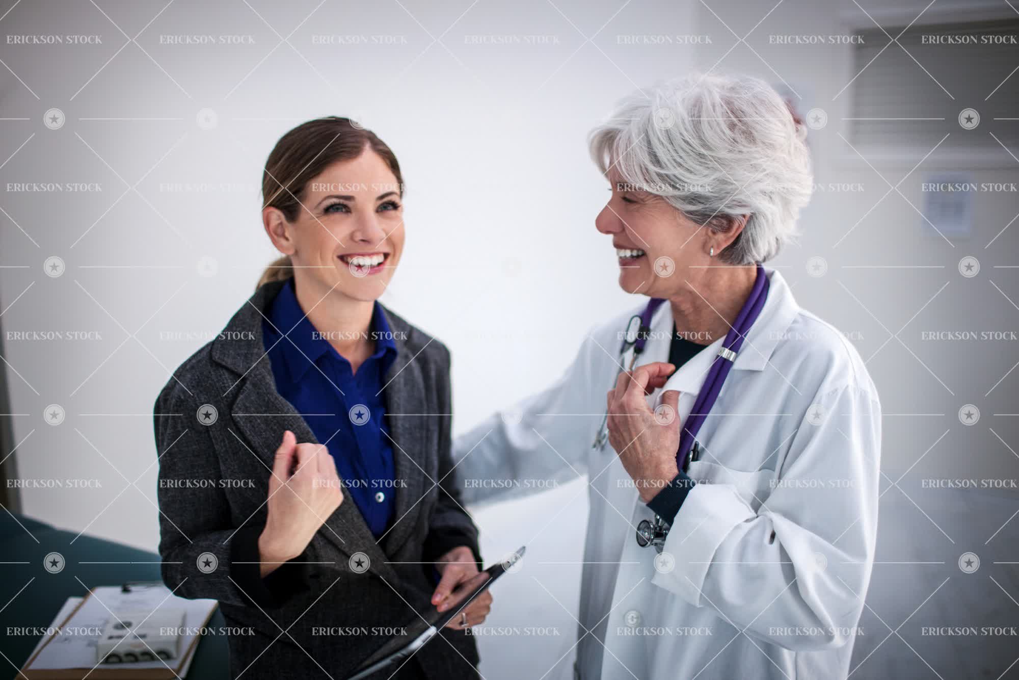 Smiling female doctor speaking with a pharmaceutical representative inside a hospital.