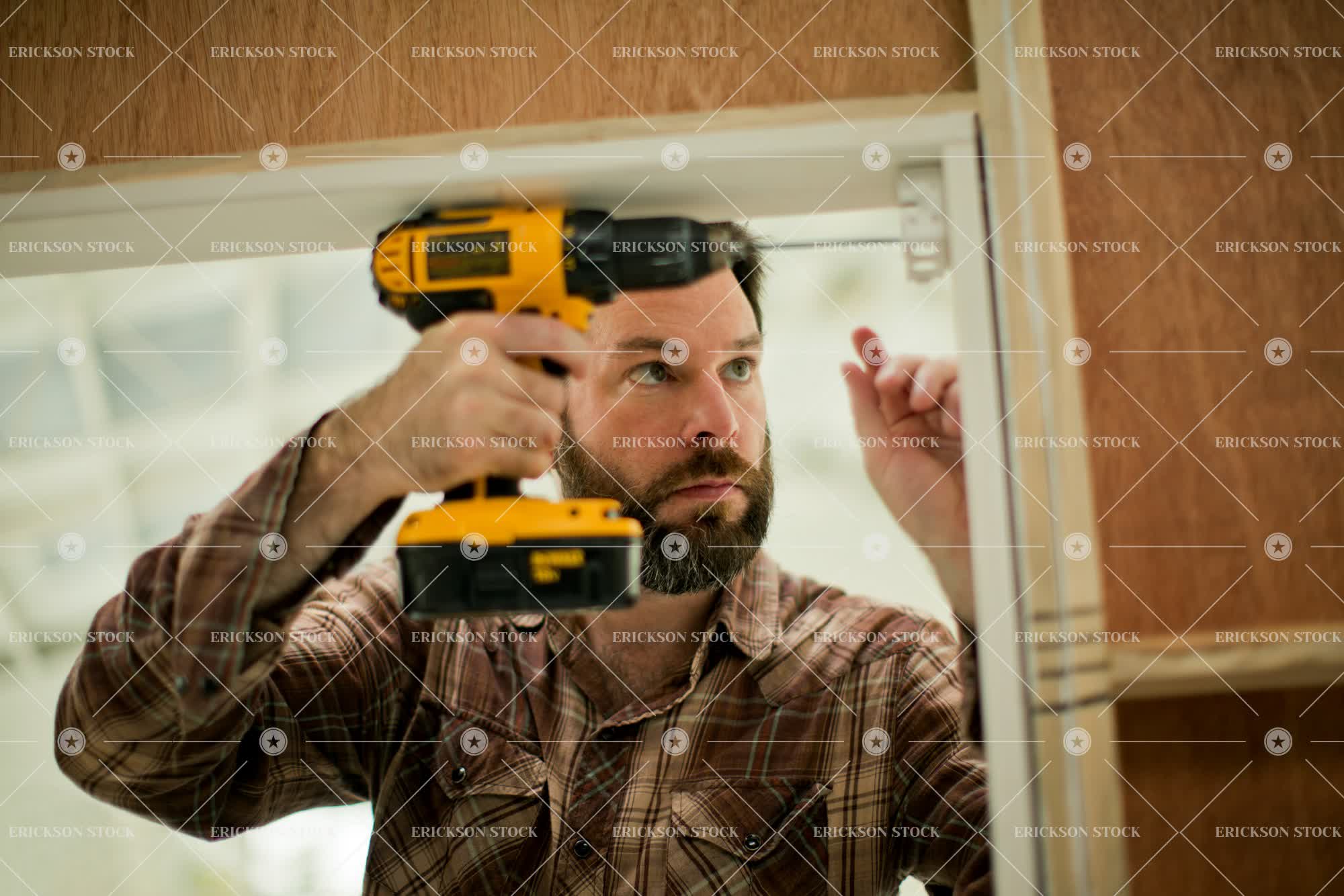 Tags accuracy, adult, aim, attempt, beard, brunette, button down shirt, casual clothes, caucasian, checkered, collared shirt, concentrate, copy space, do it yourself, door, doorframe, doorway, drill, electric drill, electric drills, entrance, entry, entryway, entryways, facial hair, fix, fixes, fixing, frame, Fun, grip, gripping, grips, hand tool, hand tools, handyman, having fun, head, head & shoulders, head and shoulders, head shot, headshot, hold, holding, holds, home, home improvement, home interior, home interiors, homes, house, house interior, house interiors, houses, indoor, indoors, inside, interior, interiors, leisure, leisure activities, leisure activity, lumberjack shirt, male, man, mend, mending, mends, mid adult, negative space, one person, people, person, plaid shirt, power tool, power tools, precise, precision, rebuild, rebuilding, rebuilds, recreation, recreational pursuit, recreational pursuits, remodeling, renovate, renovates, renovating, repair, repairing, repairs, screw, screwing, screws, selective focus, shirt, shirts, shoulders, take aim, taking aim, tries, try, trying, weekend activities, weekend activity, wood, wooden