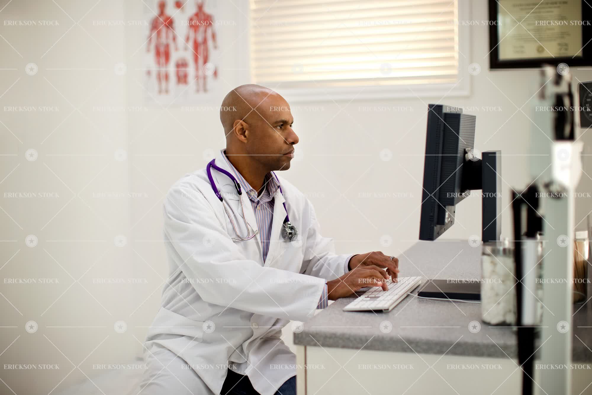 Tags adult, african american, at work, bald, clinic, colleague, communicate, computer, computer monitor, concentrate, connect, desk, desktop computer, determined, diploma, doctor, doctor's office, e-mail, e-mailing, email, emailing, examination room, expert, expertise, experts, focus, focused, half length, health, healthcare, horizontal, hospital, indoor, indoors, inside, internet, keyboard, lab coat, lab coats, male, man, mature adult, md, medical, medical practitioner, medical practitioners, medicine, mid adult, monitor, monitors, one person, online, patient records, people, person, physician, physicians, reading, researching, science, scientific, Screen, screens, selective focus, shaved head, sit, sitting, specialist, specialists, stethoscope, stethoscopes, technology, thinking, type, types, Typing, typing on keyboard, use computer, using computer, waist up, white coat, window, work, working, young adult